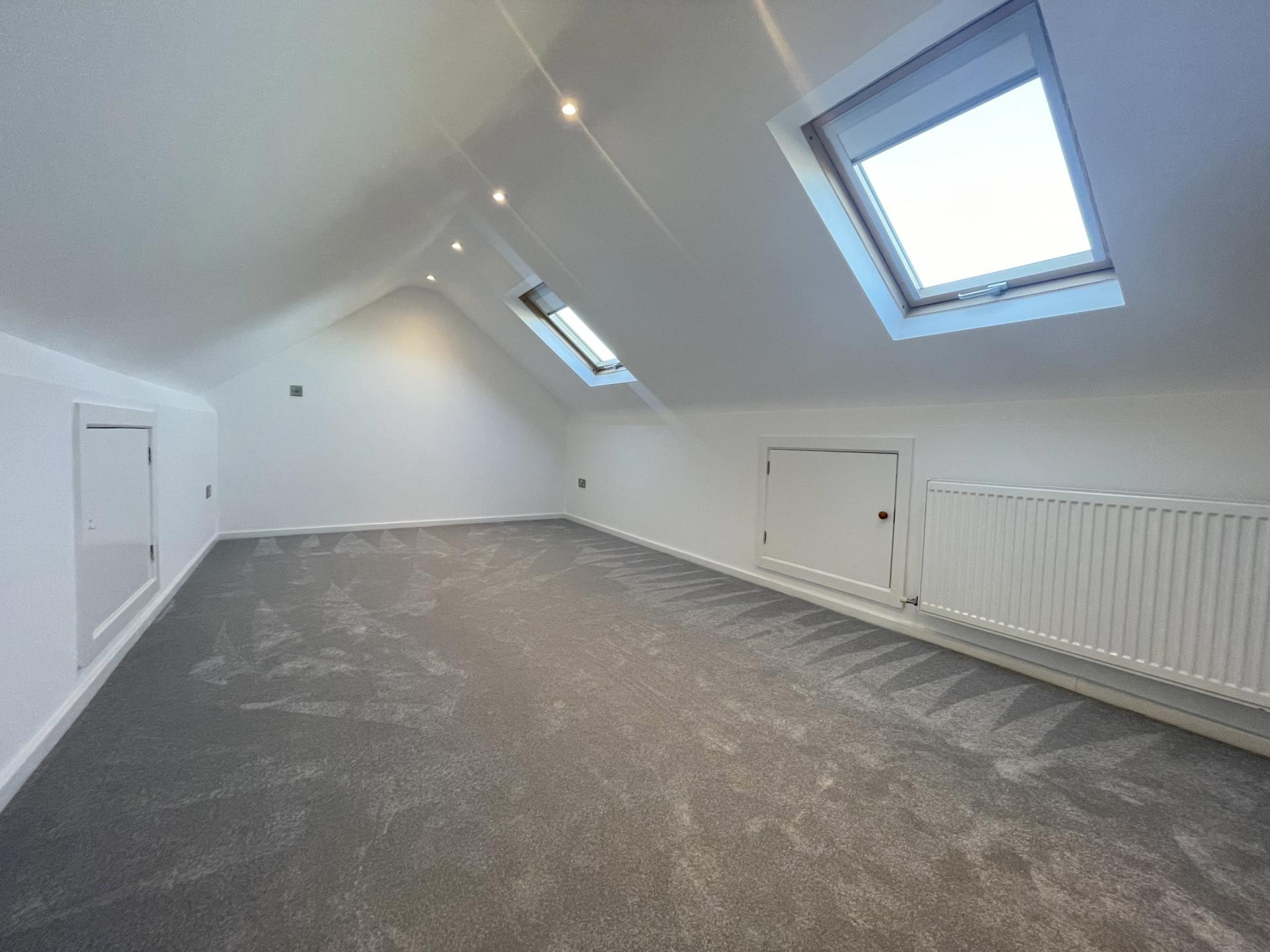 Two roof windows to rear, radiator, recessed spotlighting, access to eaves storage area. Doorway to en-suite bathroom.