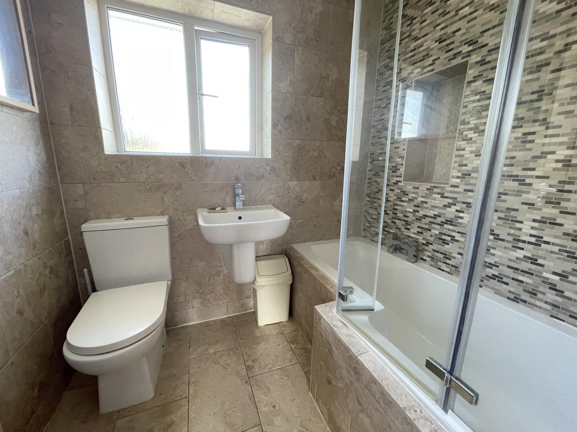 Double glazed window to rear with privacy glass, fully tiled walls, tiled enclosed shower bath with mixer taps and shower attachment with glass shower screen, low level w.c, 1/2 pedestal wash hand basin with mixer taps, tiled floor, heated towel rail.