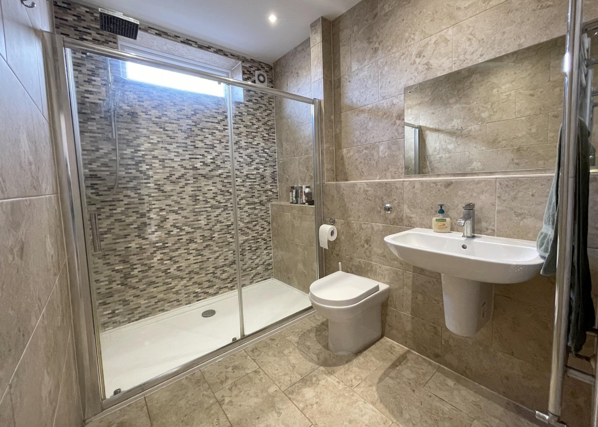 Double glazed window to side, fully tiled walls, 1/2 pedestal wash hand basin with mixer taps & mirror above, low level w.c with concealed cistern, walk in shower with glass shower screen and thermostatic shower with rainwater shower fitting and separate handheld attachment, heated towel rail, tiled flooring.