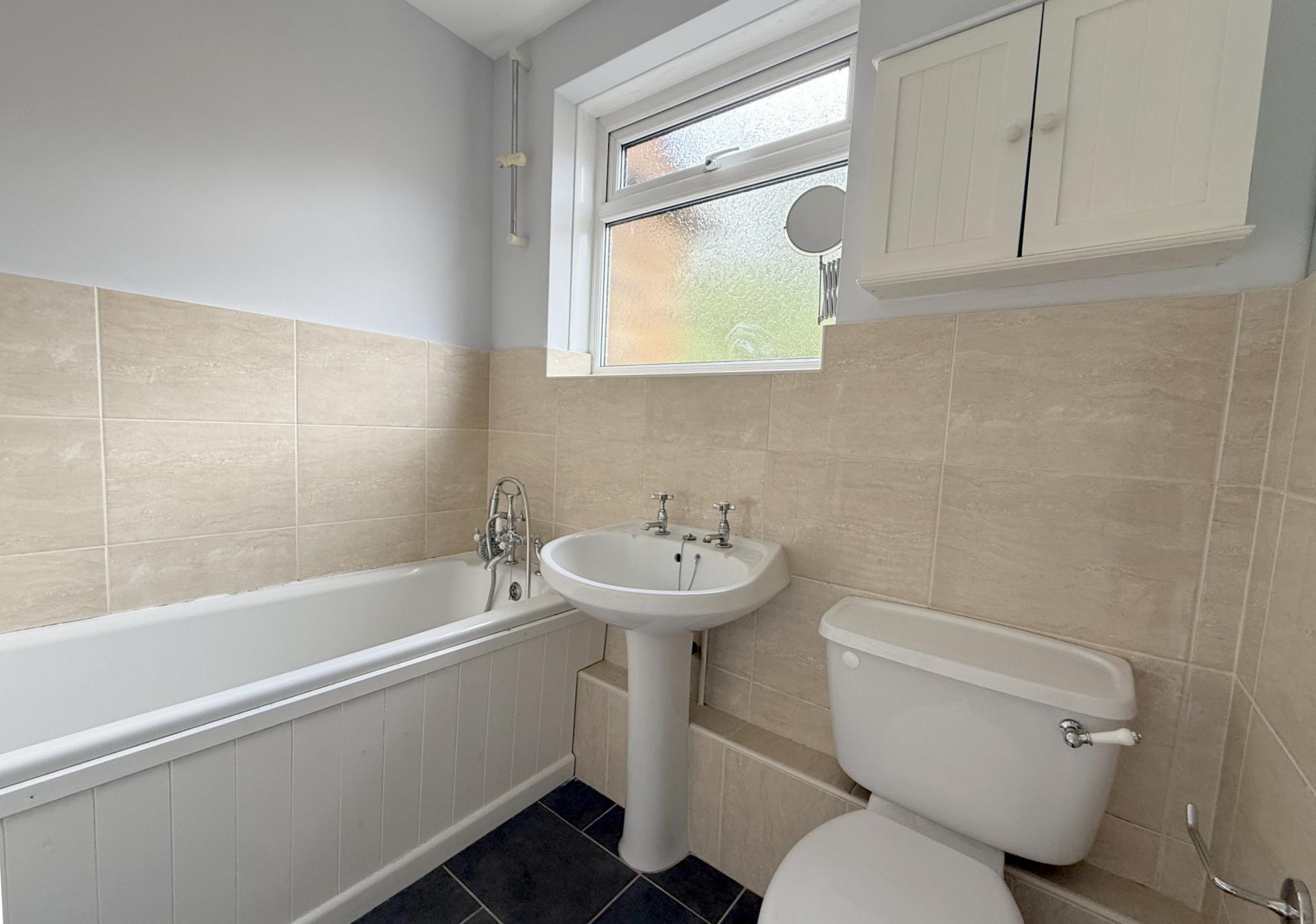 Double glazed window to front with obscured glass, panel enclosed bath with mixer taps and sprayhead, pedestal wash hand basin, low level w.c, half tiled walls, wall mounted bathroom cabinet, heated towel rail, tiled flooring.