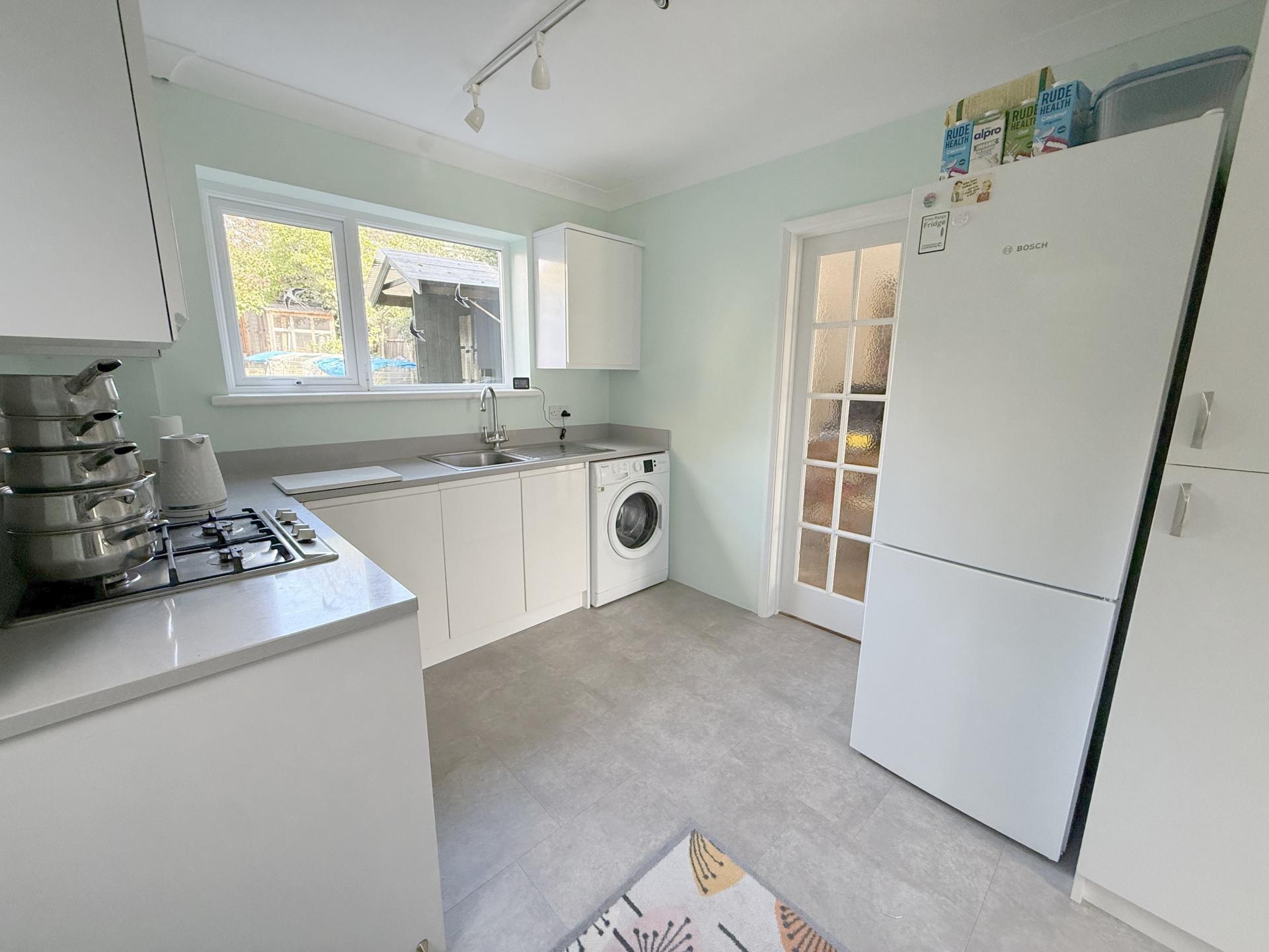 Double glazed window to rear overlooking garden, double glazed door to side, coved ceiling, worktops with a range of matching white gloss wall, base & drawer units, single bowl stainless steel inset sink unit with mixer taps and drainer, 4 ring gas hob with built in electric oven below and cooker hood above, space & plumbing for washing machine, space for tall fridge/freezer, Amtico tile effect flooring, door to dining area.