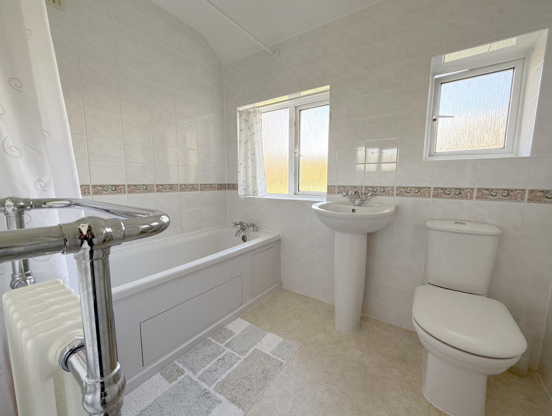 Two double glazed windows to rear, recessed spotlighting, white suite comprising low level w.c, pedestal wash hand basin, panel enclosed bath with independent thermostatic shower above, heated towel rail/radiator, fully tiled walls with decorative border tile.