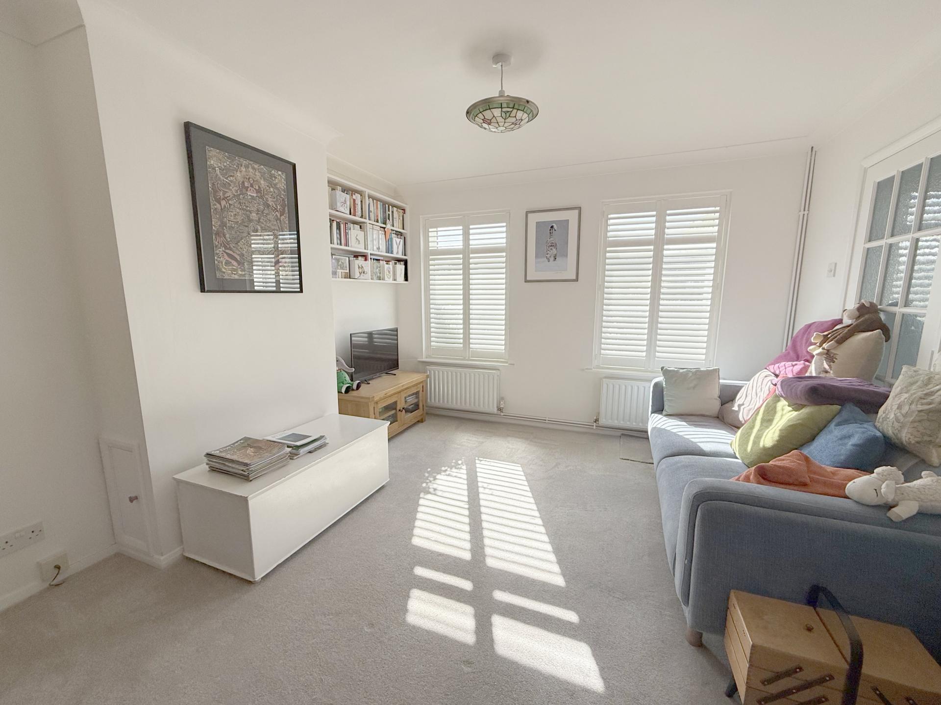 Two double glazed windows to front with fitted shutters, double glazed patio doors to rear leading out to garden, coved ceiling, wall light, two double radiators, vertical double radiator, wood effect Amtico flooring in dining area, carpeted lounge area.
