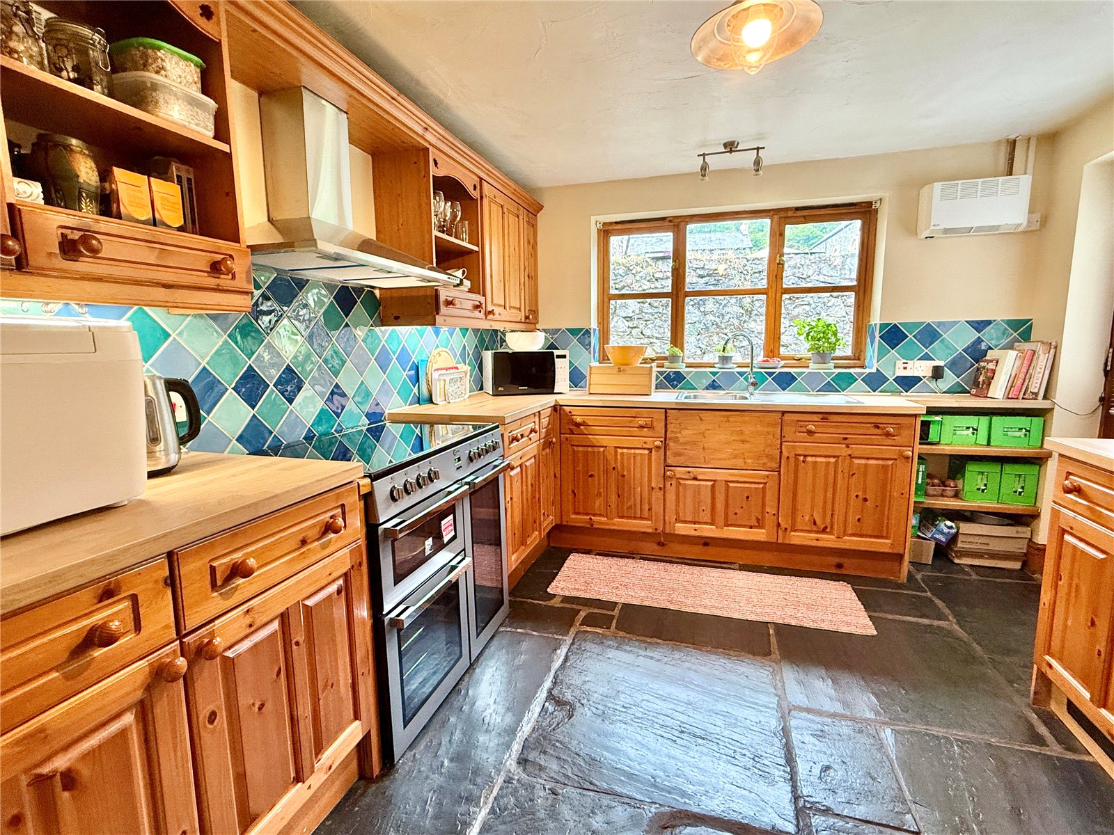 An entrance porch leads to the sitting/dining room which has a flagstone floor and a feature stone chimney breast. There is useful under stairs storage and a ground floor wc with wash basin and Wc. The living room has oak boarded flooring and a feature stone fireplace with inset multi fuel stone sat on a slate hearth. The kitchen to the rear of the property has a range of units with modern work surfaces and an integrated fridge, freezer and washing machine. There is also an electric range cooker with extractor hood.