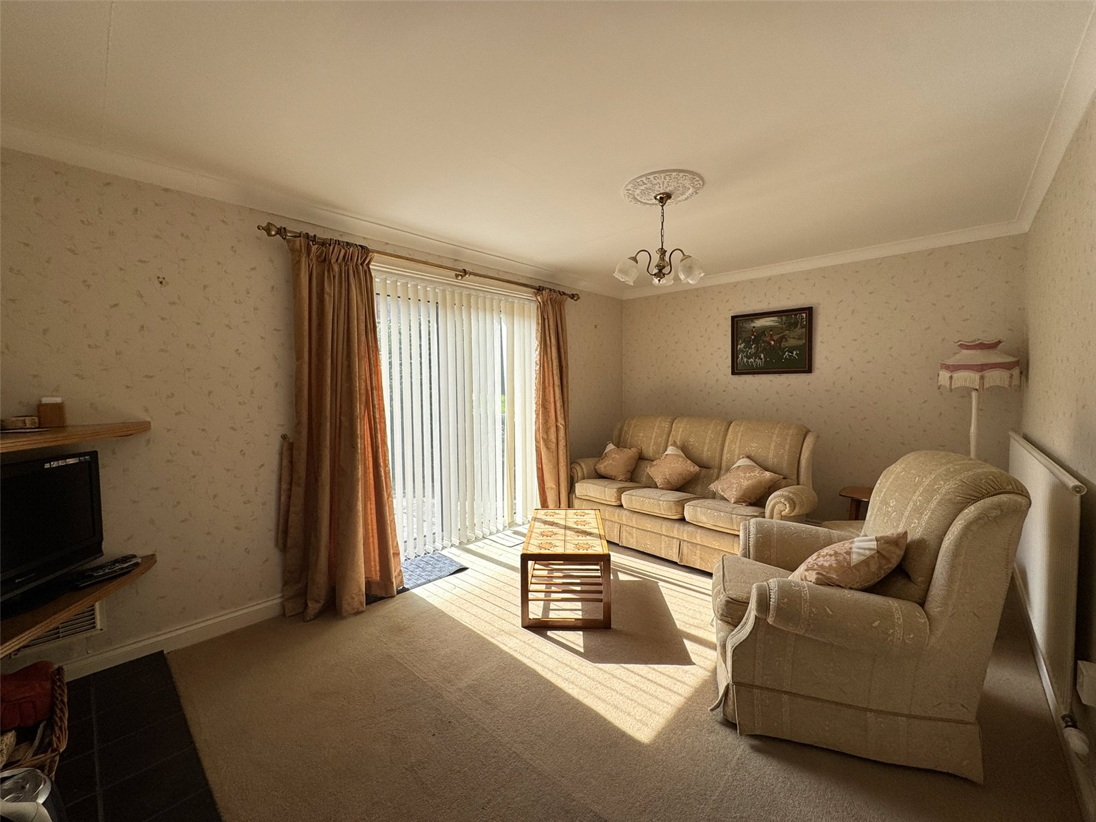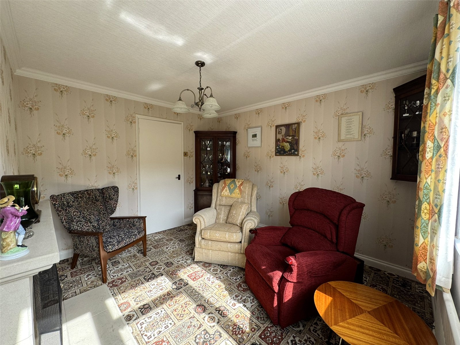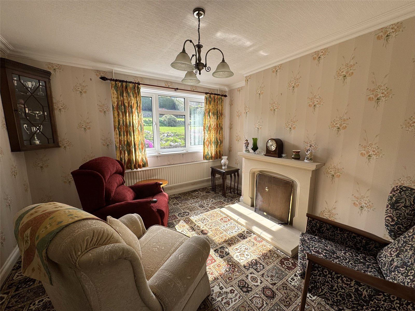 Sitting Room (11'2 x 9'10) with open fireplace, radiator and wide picture window overlooking rear garden.
