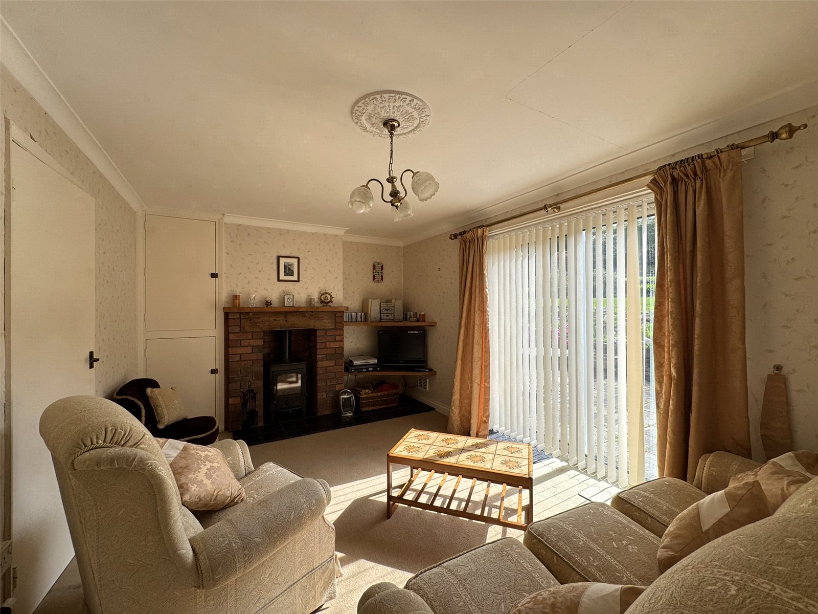 Living Room (15' x 10'2) with wood burner inset to brick surround, built-in cupboards to recess beside, radiator and sliding doors to rear patio.