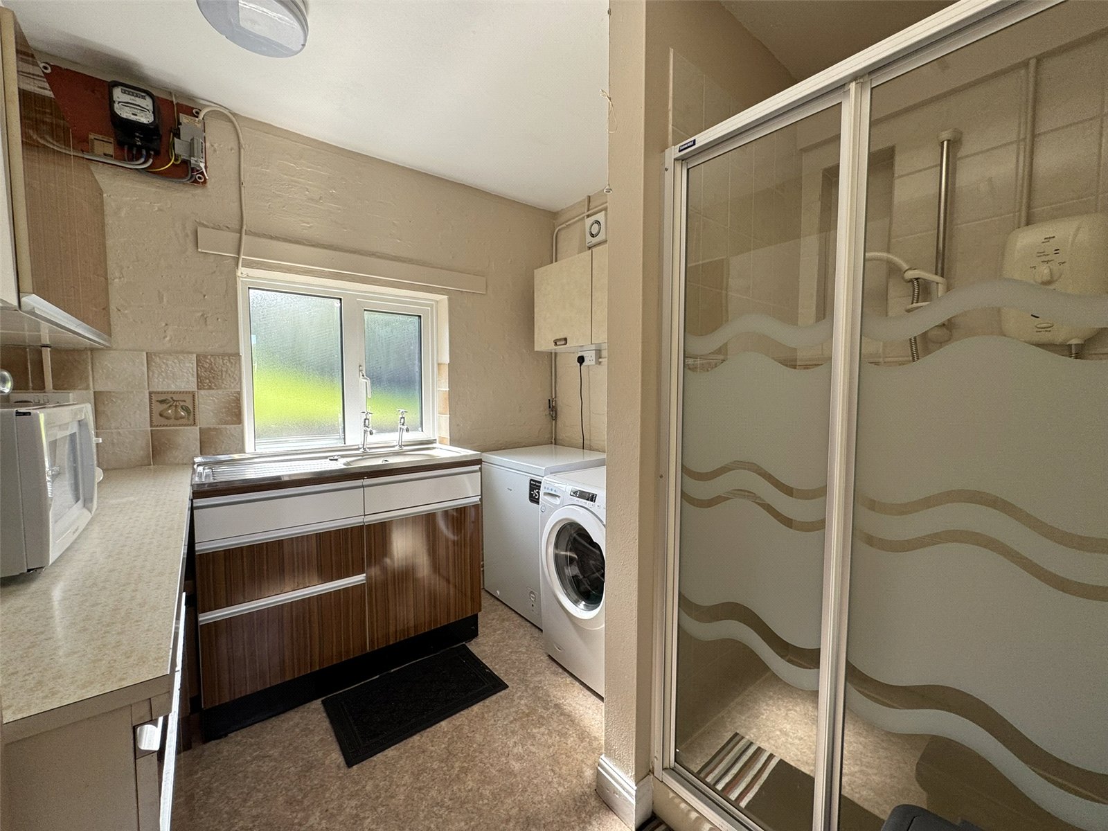 Utility/Shower Room (8'1 x 8'3) with base and wall cupboards to 3 walls, stainless steel sink unit, plumbing for automatic washing machine, radiator and heated towel rail. Shower cubicle with electric shower over and tiled surround.