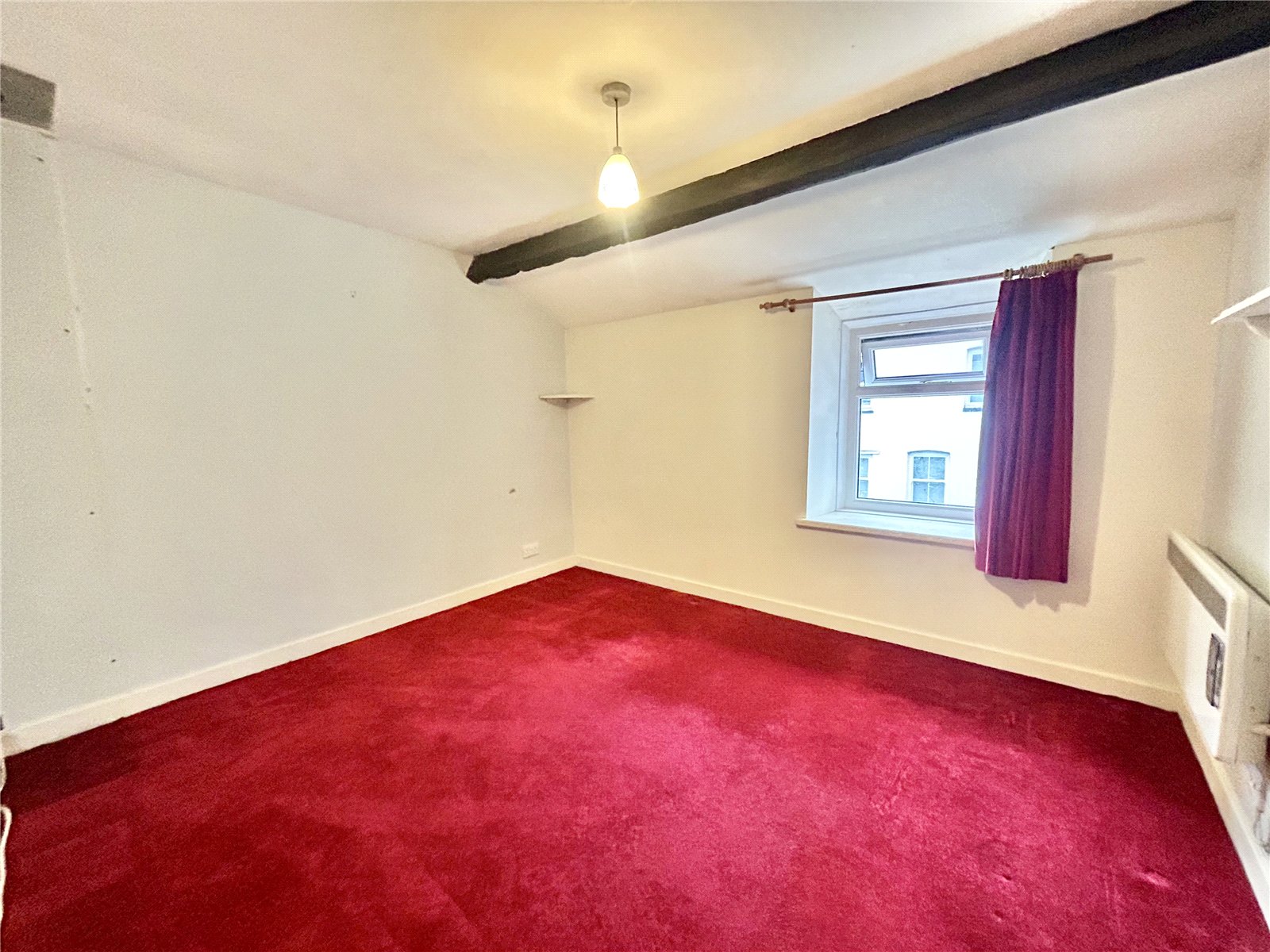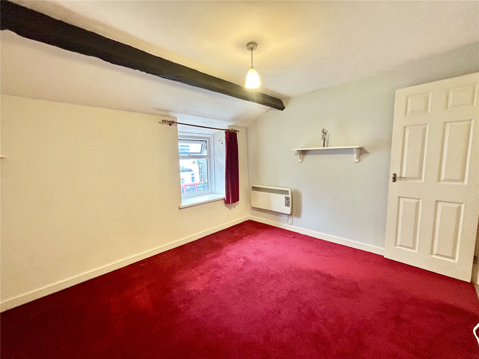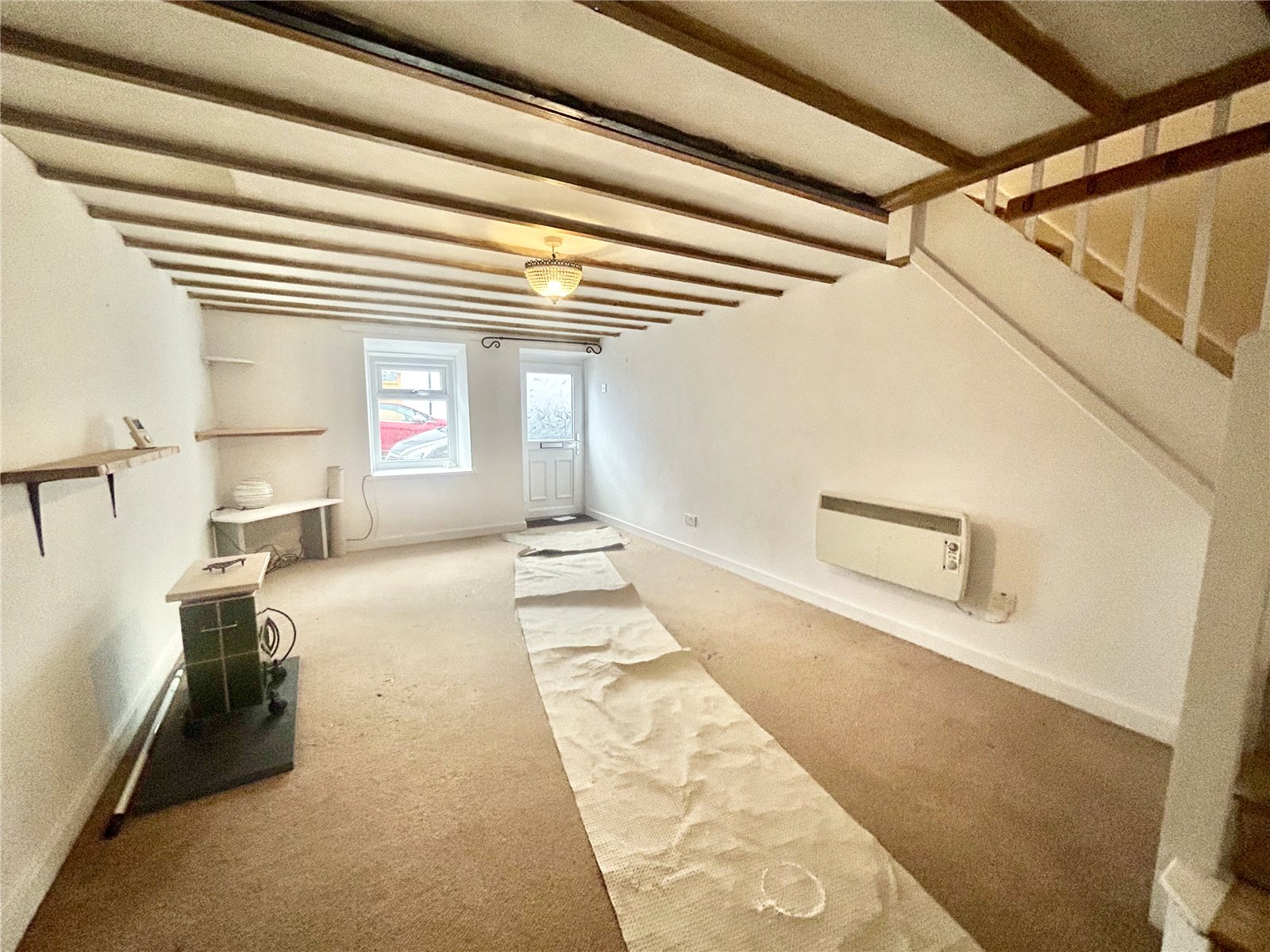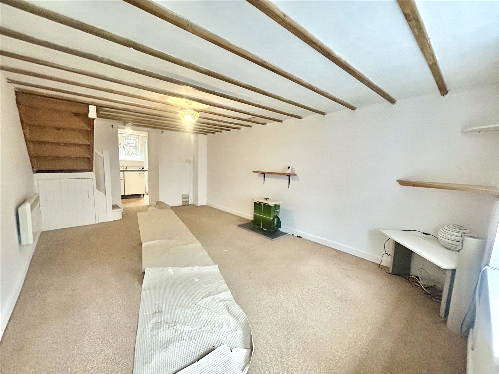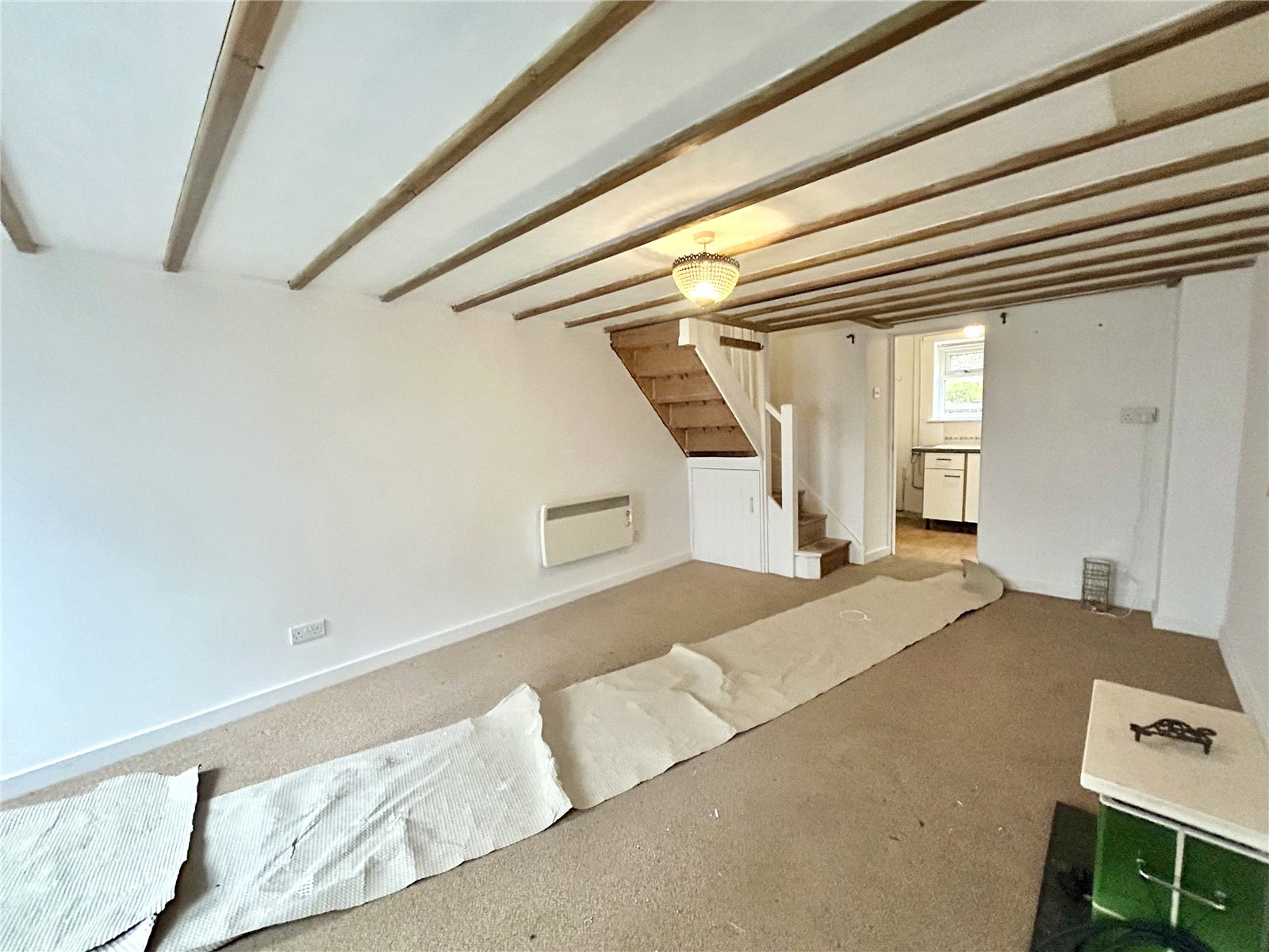 Living Room (10'10 x 18') with exposed beam ceiling, stairs off with cupboard below and wall mounted panel heater. Opening to