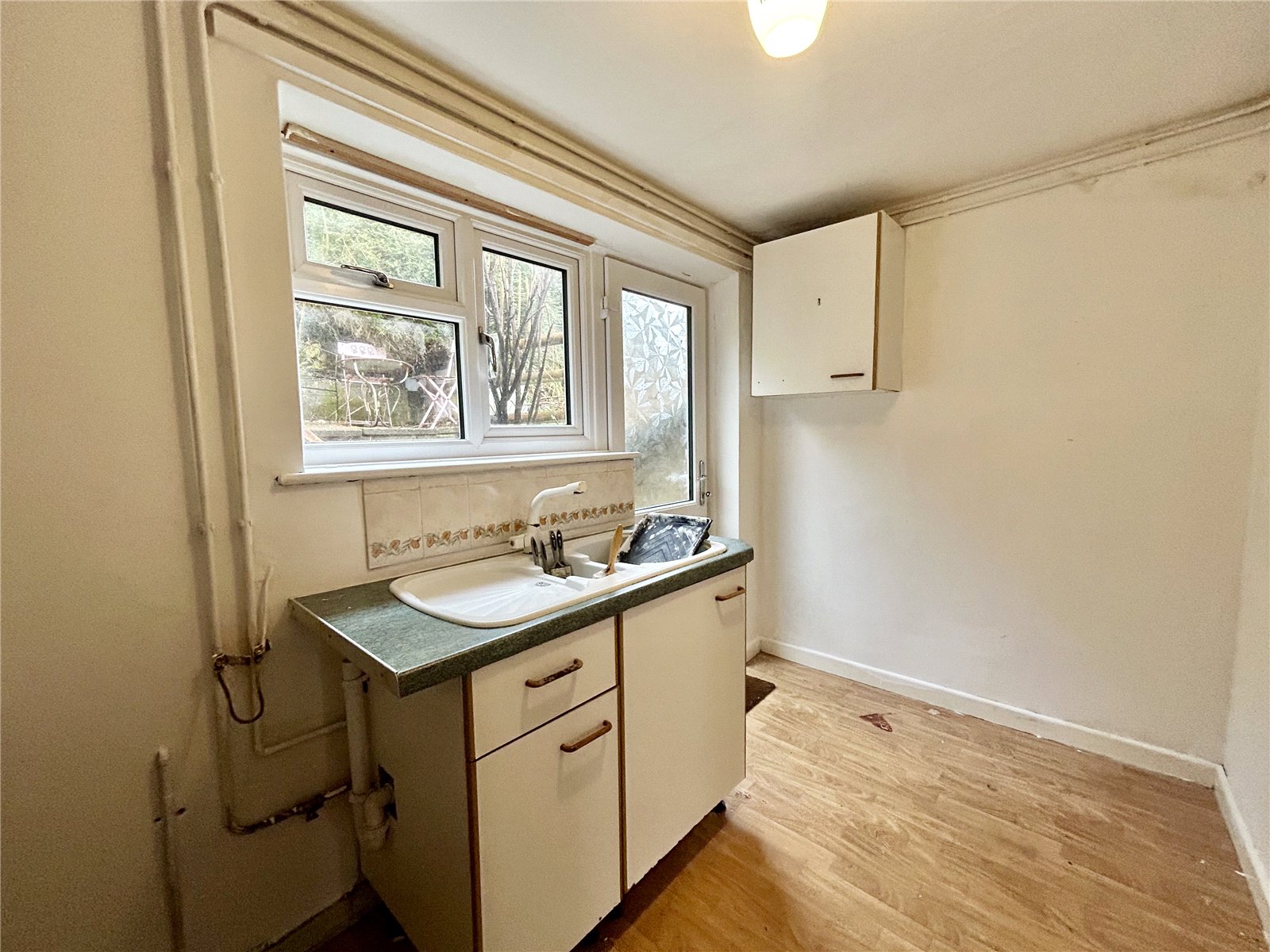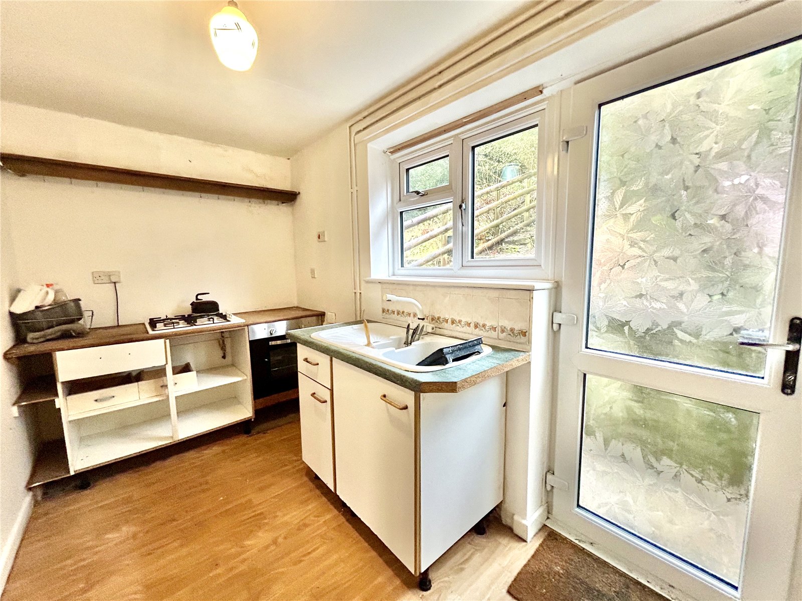 Kitchen (11'7 x x 6') with wood effect linoleum flooring and rear external door. Integrated electric oven and 4 ring gas hob, sink and drainer unit.
