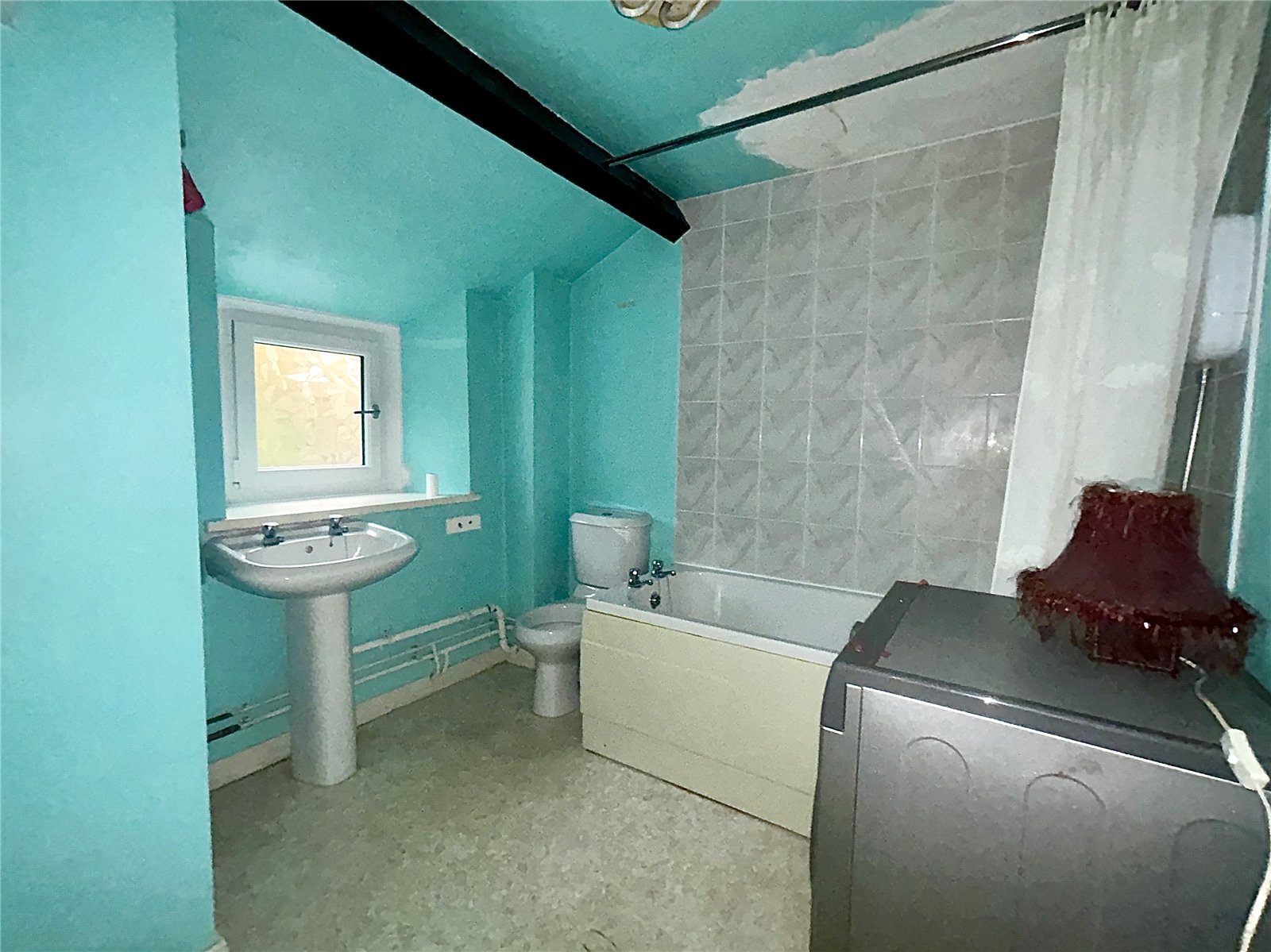 Bathroom (8'4 x 8'1 max) with linoleum flooring and cupboard housing hot water cylinder. Pedestal wash hand basin, WC, panel bath with tiled surround and electric shower over.