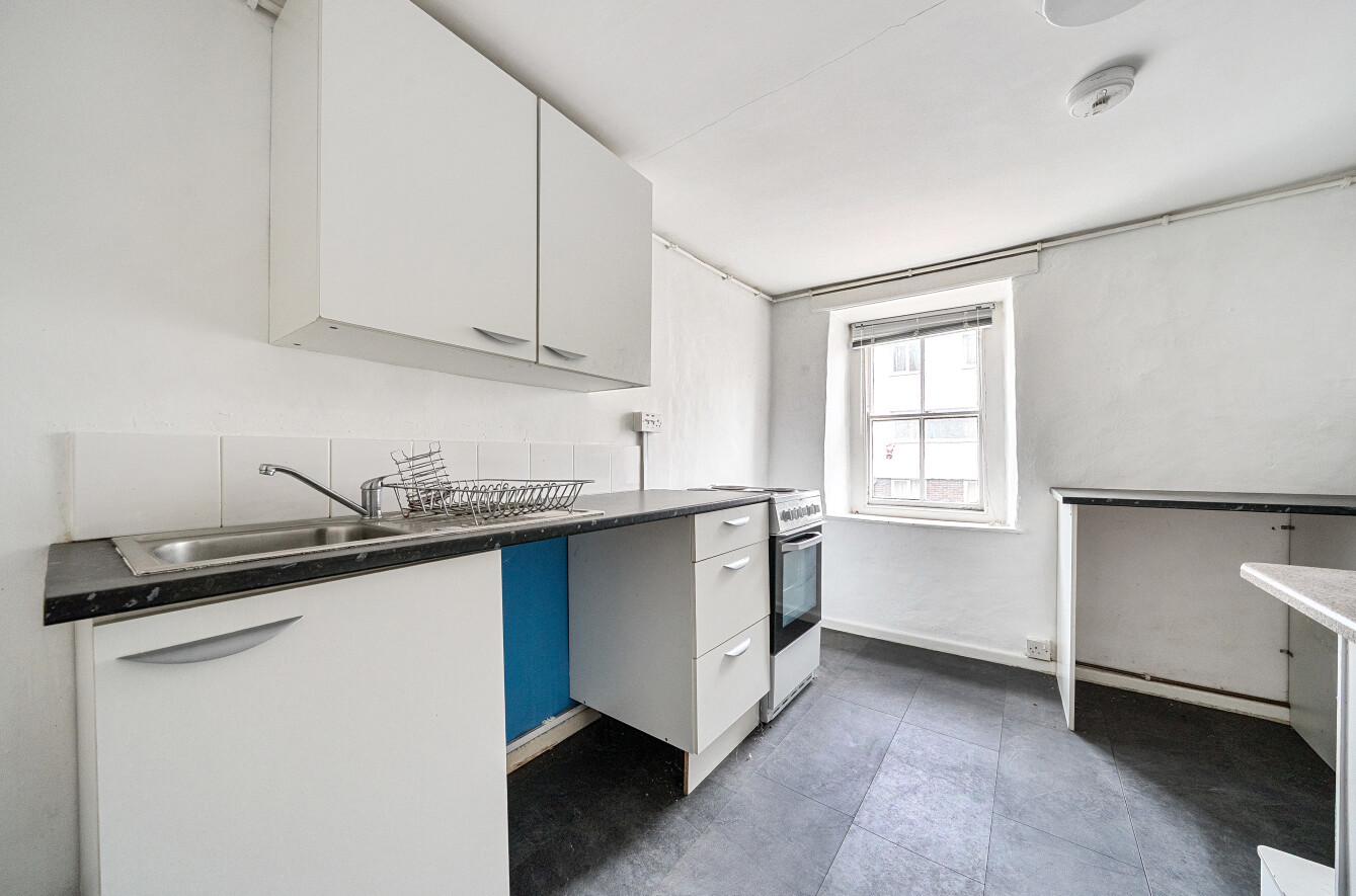 Kitchen (6'2 x 5'1) comprising of base and wall cupboards to 2 walls with stainless steel sink unit inset and plumbing for automatic washing machine, under space for fridge.