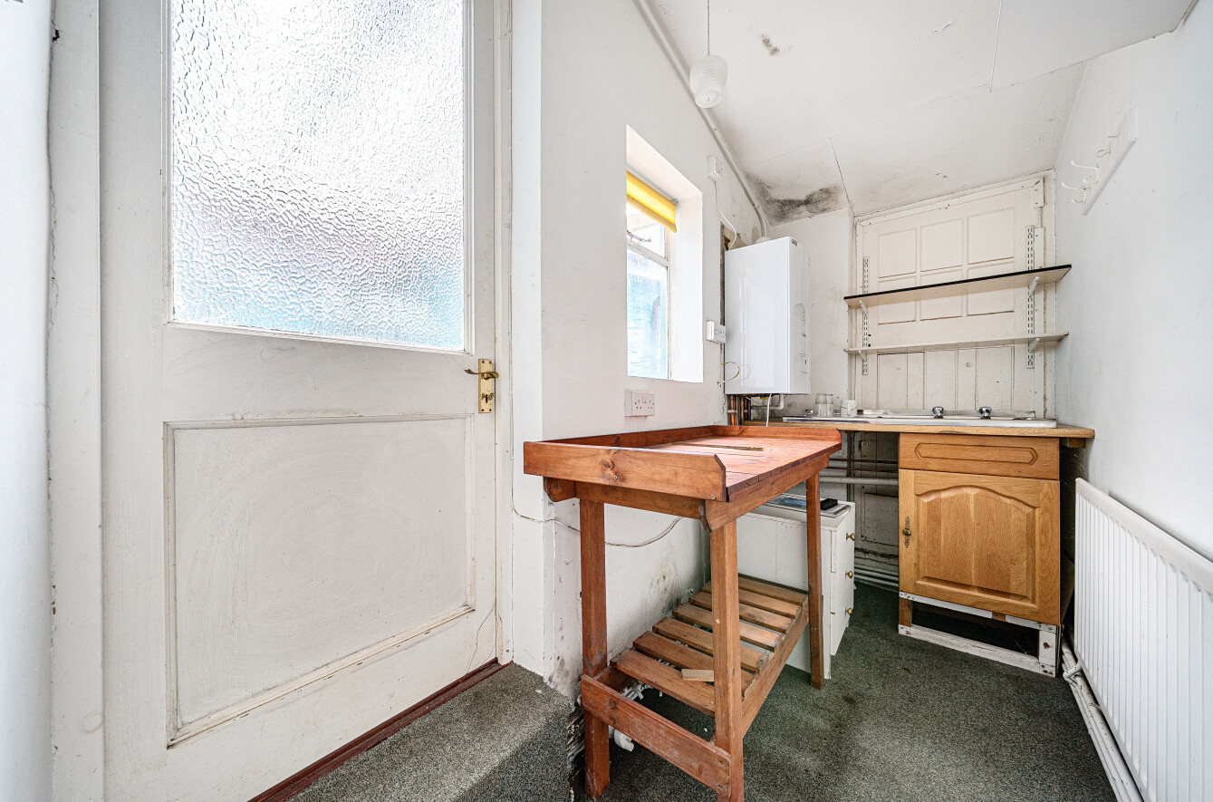 Kitchen (4'2 x 15') with stainless steel sink unit, gas boiler, radiator and door to rear courtyard.