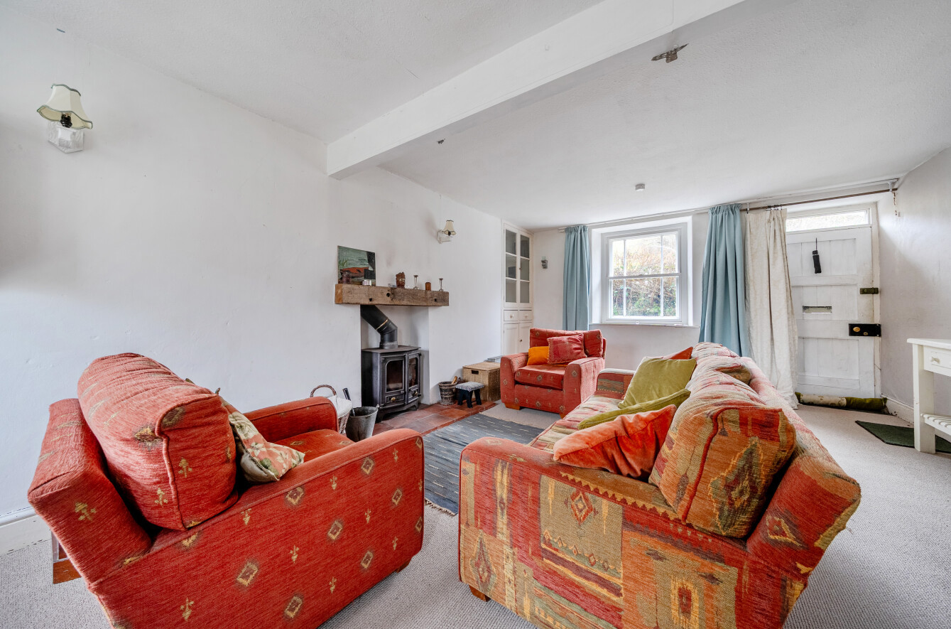 Living Room (19'5 x 12'4) with sash windows to front and rear elevation. Fireplace with oak mantle and quarry tile hearth, wood burning stove inset. Built-in cupboard, stairs to lower ground floor and first floor.