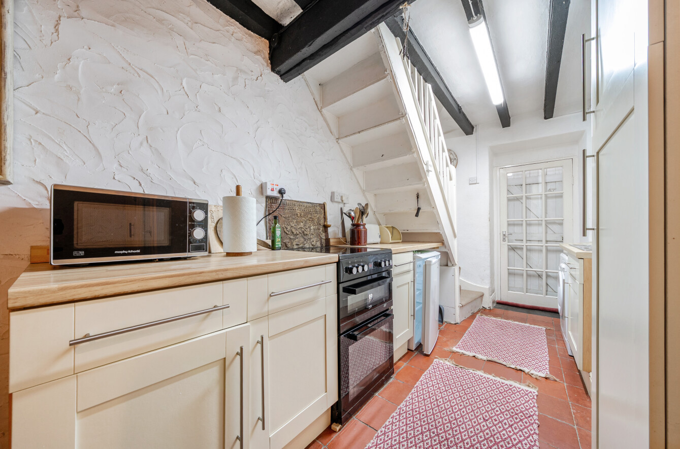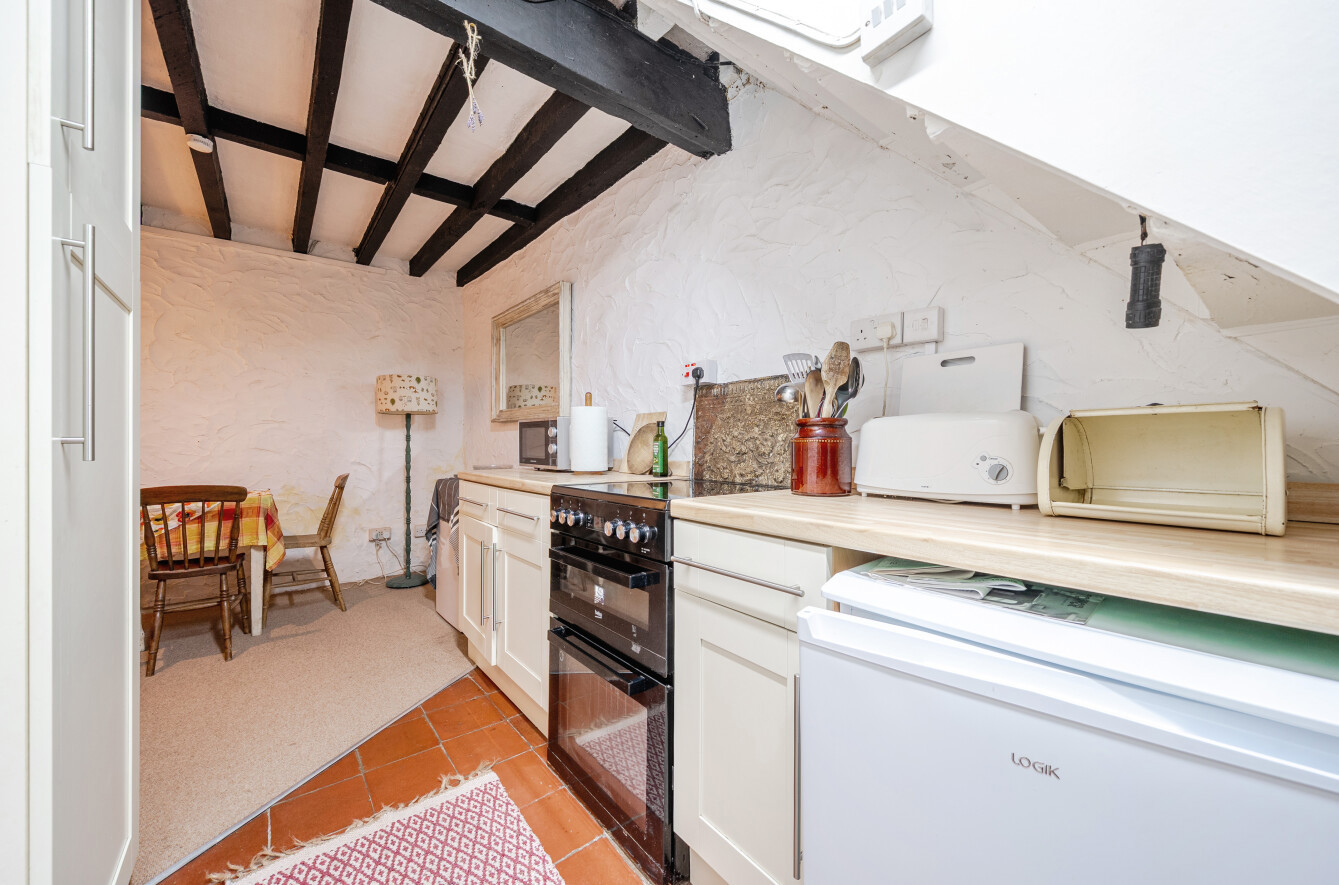 Kitchen (9'10 x 7'3 max) with quarry tiled floor, exposed beam ceiling and external door to rear garden. Kitchen comprises modern shaker style base units to 2 walls with additional full height cupboard, stainless steel sink unit inset with plumbing for automatic washing machine and space for electric oven. Open to