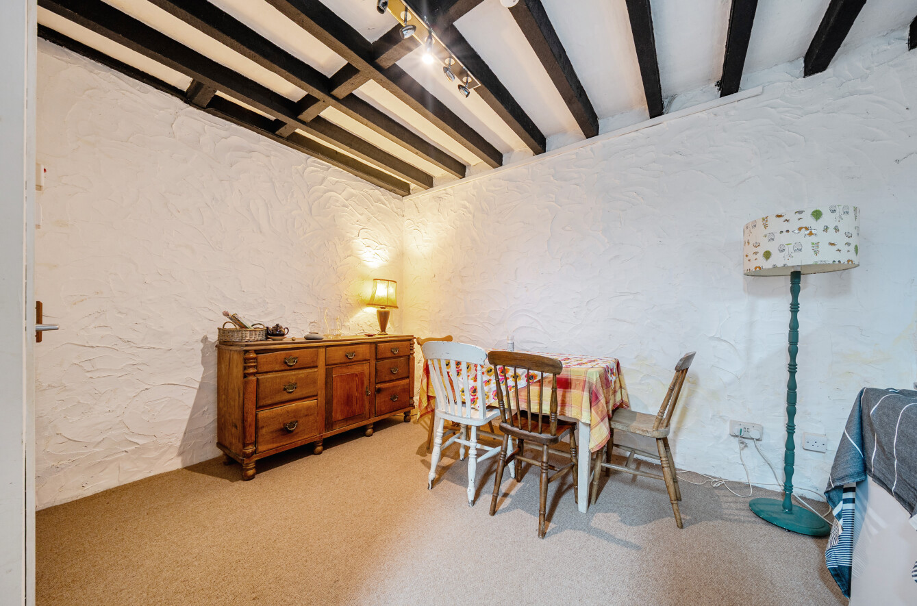 Dining Area (12' x 8'10) with exposed beam ceiling, cupboard housing immersion heater and door to