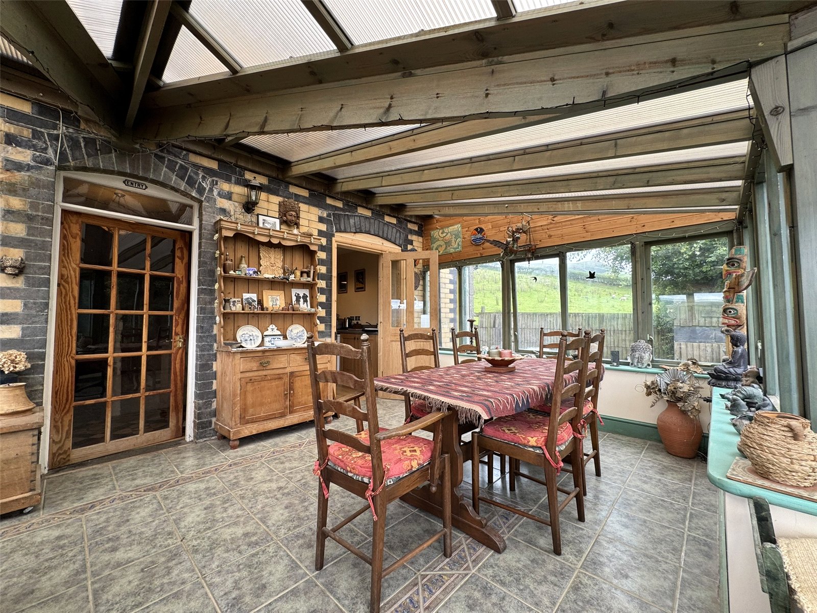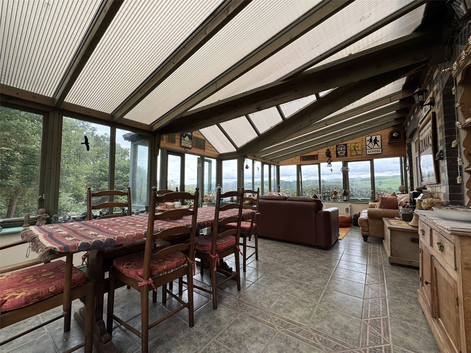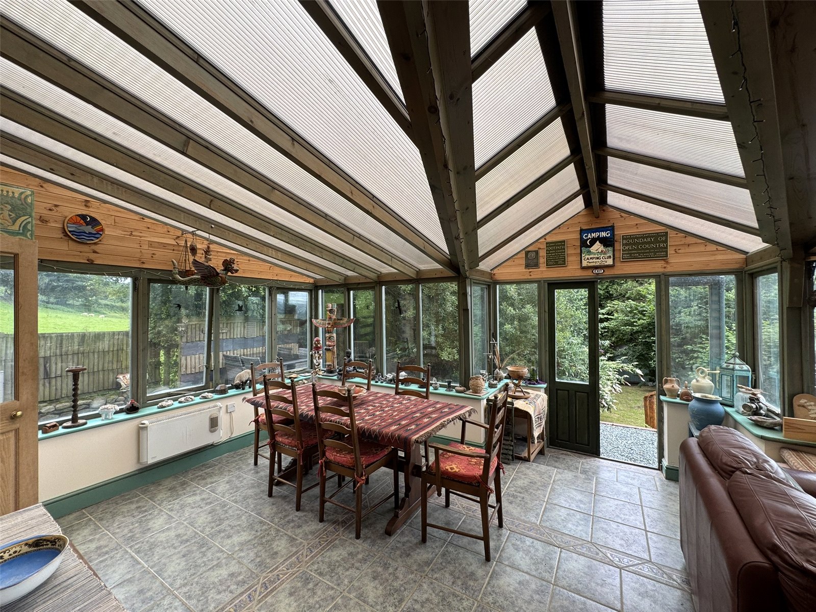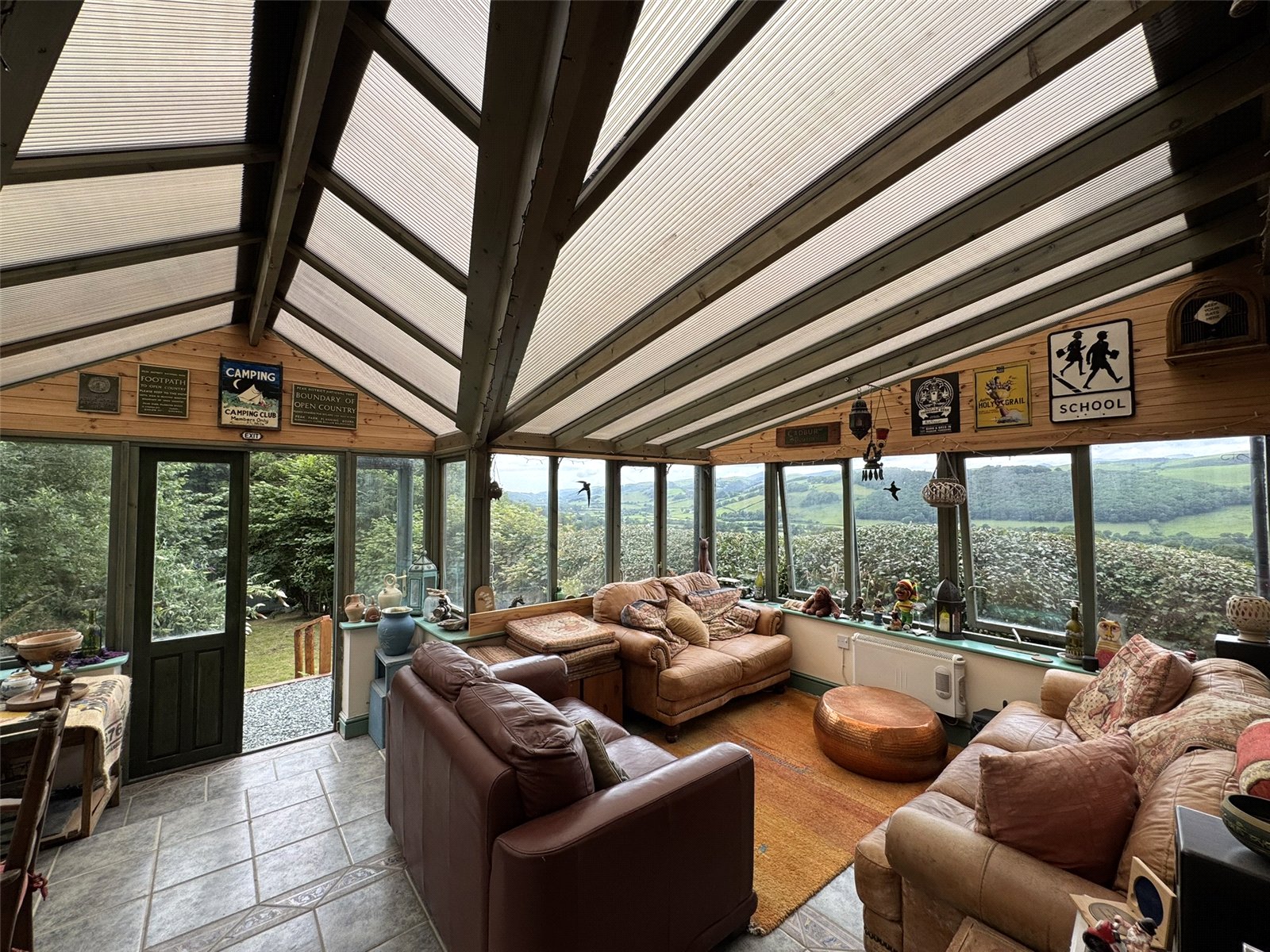 Sun Room (11'7 x 23'5) the heart of the home. A tranquil space with spectacular views across the rolling hills of the Dyfi Valley below. Timber framed and fully double glazed with French doors to rear patio and polycarbonate roof. Ceramic tiled floor and 2 convection heaters.
