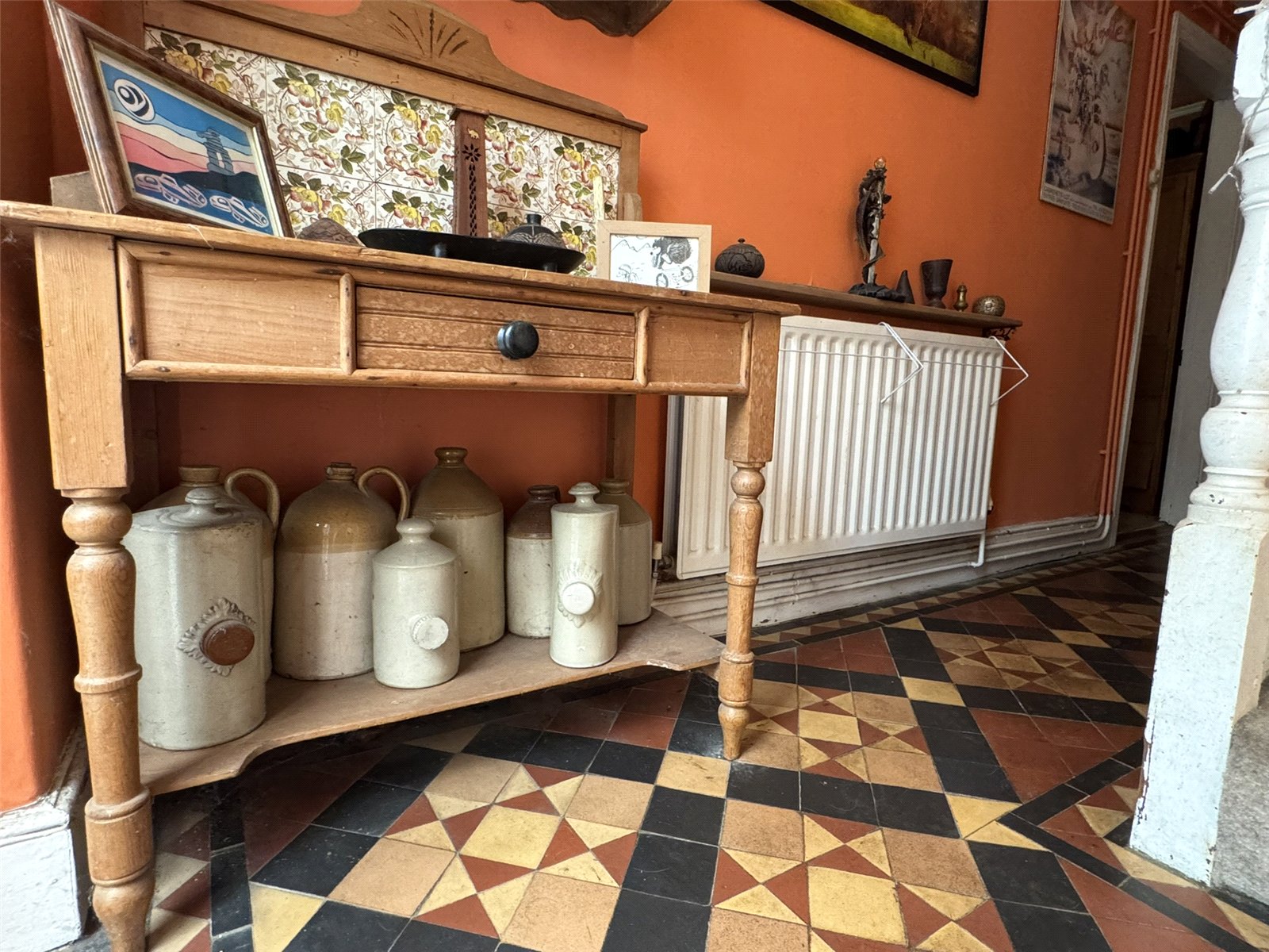 Hall with original mosaic tiled floor and stairs off. Radiator and doors to