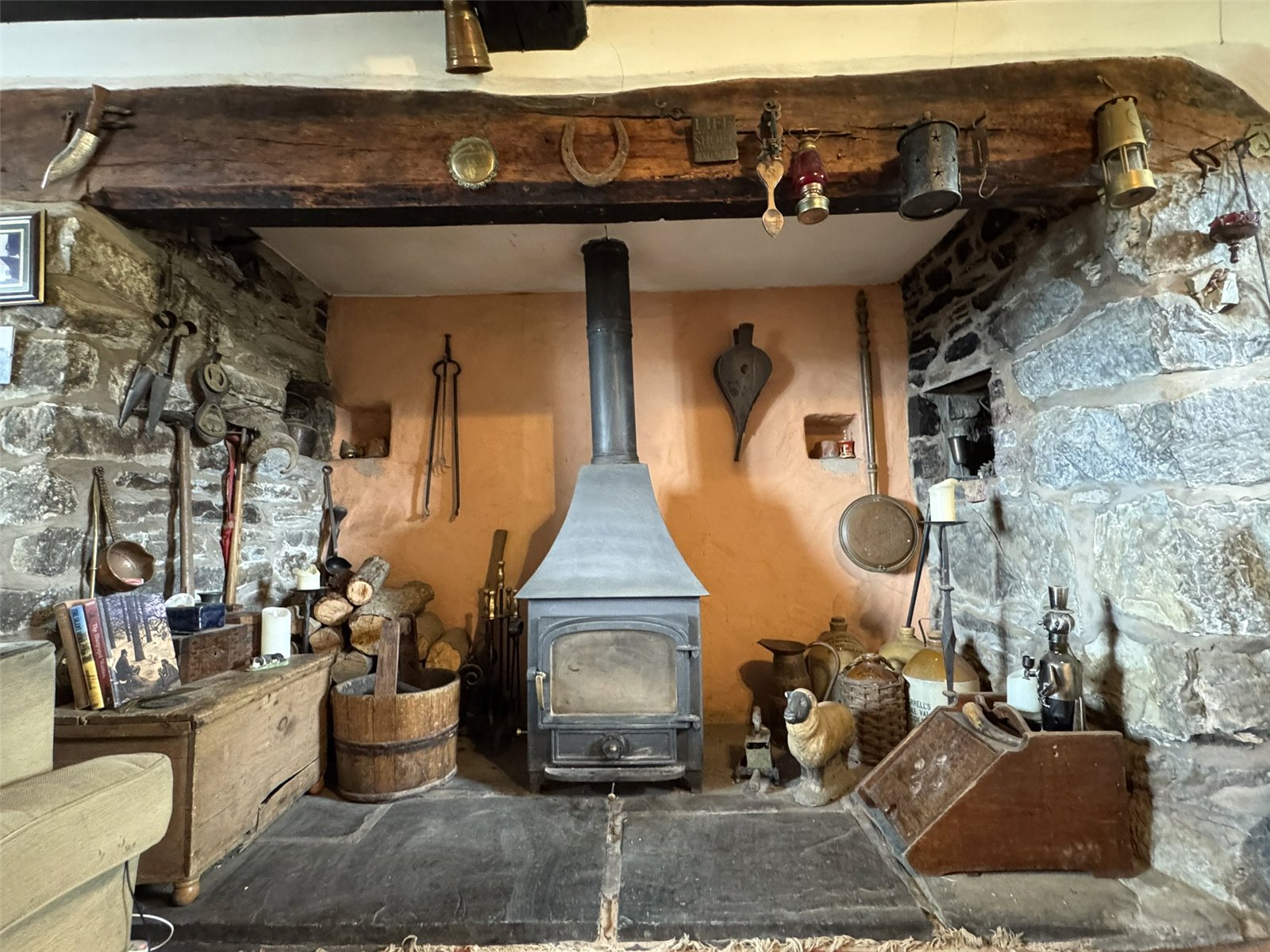 Living Room (16'4 x 15'10 max) with dual aspect windows providing far reaching views across the Dyfi Valley. Exposed beam ceiling and exposed beam work to one wall, feature Inglenook fireplace with stone surround and Oak lintel above with Clear View multi fuel stove inset on slate hearth and original bread oven to side. Radiator and door to