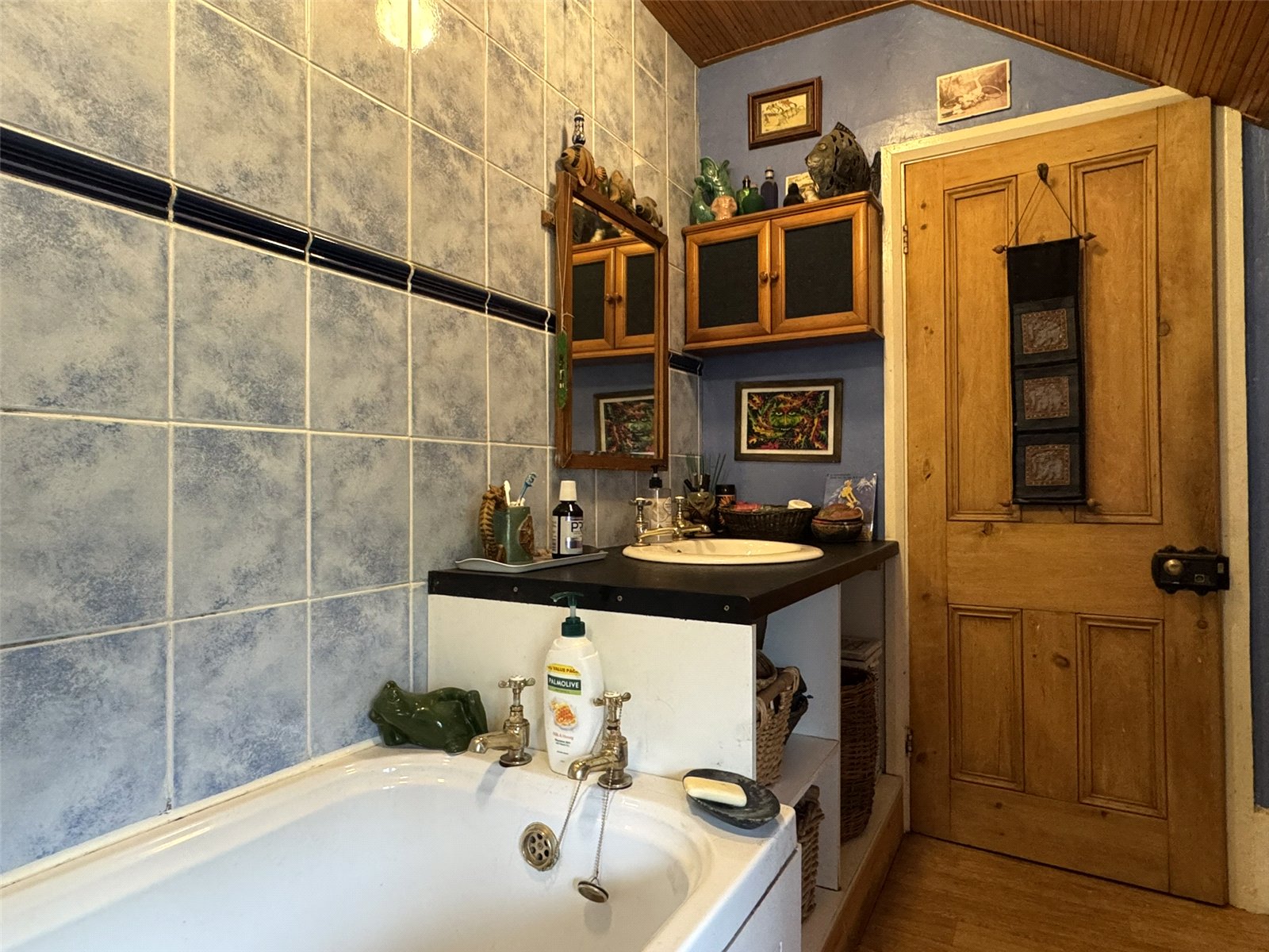 Bathroom (4'8 x 9'6) with vinyl flooring and 2 fully tiled walls. Bathroom suite comprising low level WC, panel bath with electric shower over and vanity wash basin. Panelled ceiling and radiator.