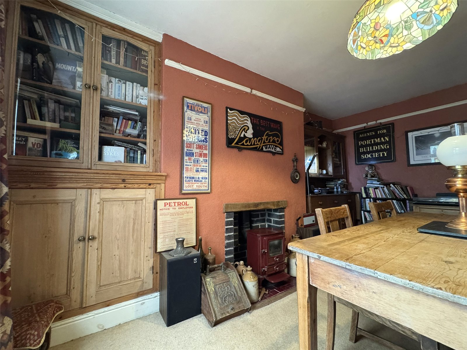 Dining Room (15'4 x 8'10) with glazed window to Conservatory. Brick fireplace and maroon tiled hearth with complimenting wood burner, built-in cupboard, half glazed, to recess at side. Period picture rail and radiator.