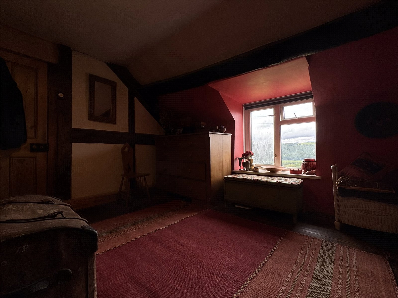 Bedroom 1 (16'5 x 12'3) built-in exposed beam ceiling and exposed beam work to one wall. Original floorboards and built-in cupboards above and to the side of the chimney breast, radiator. Deep window sill looking out to views across the surrounding hillside.