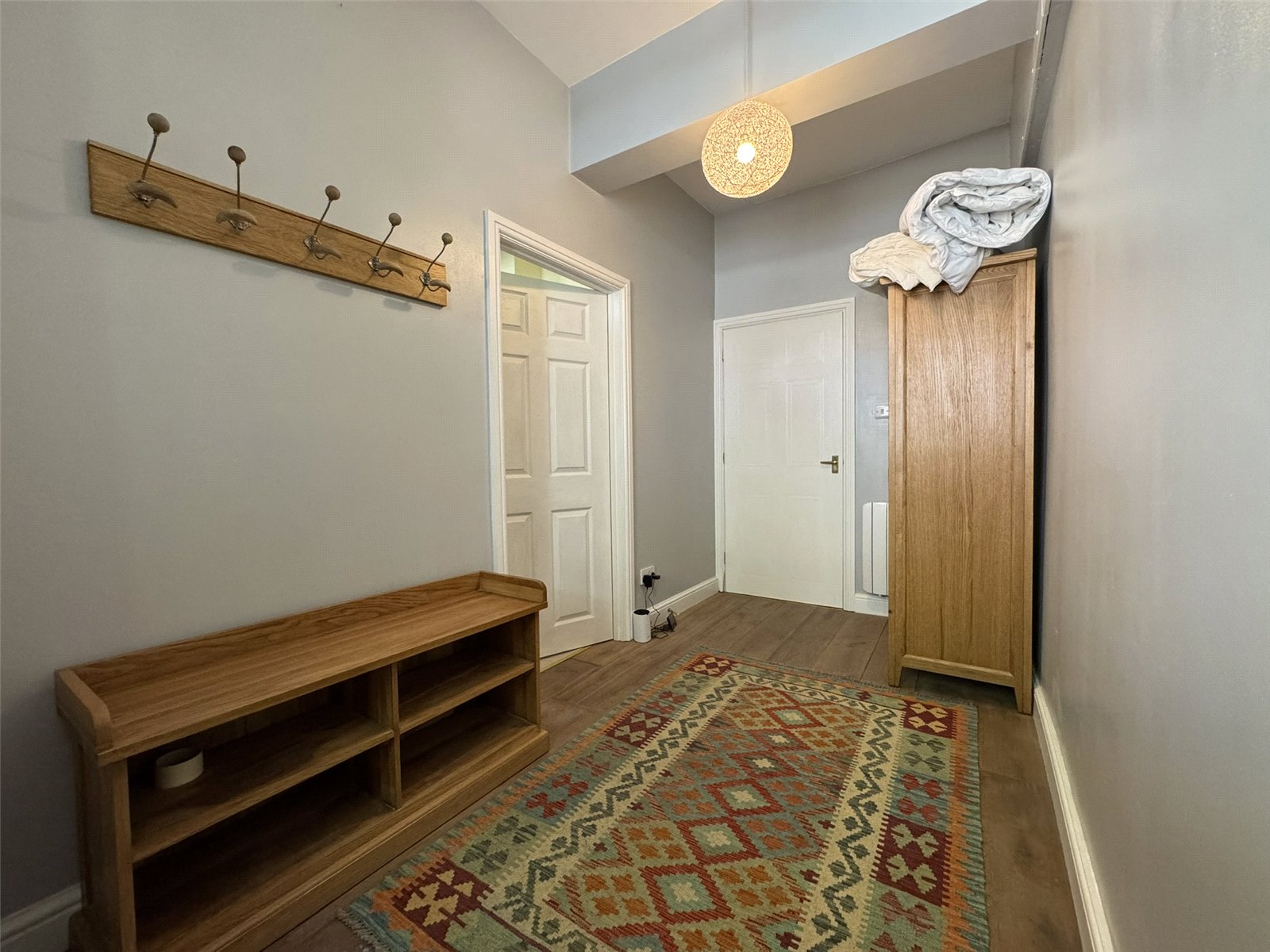 Wide Entry Hall with exposed wooden flooring and electric radiator. Door to