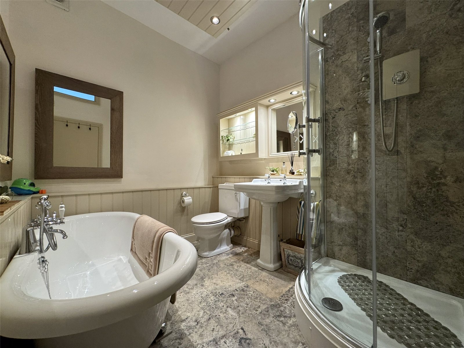Bathroom (8'9 x 7'9) with ceramic tiled floor, half panelled walls, double electric radiator. White bathroom suite comprising WC, pedestal wash hand basin, stand alone roll top bath and separate corner shower cubicle with electric shower over.