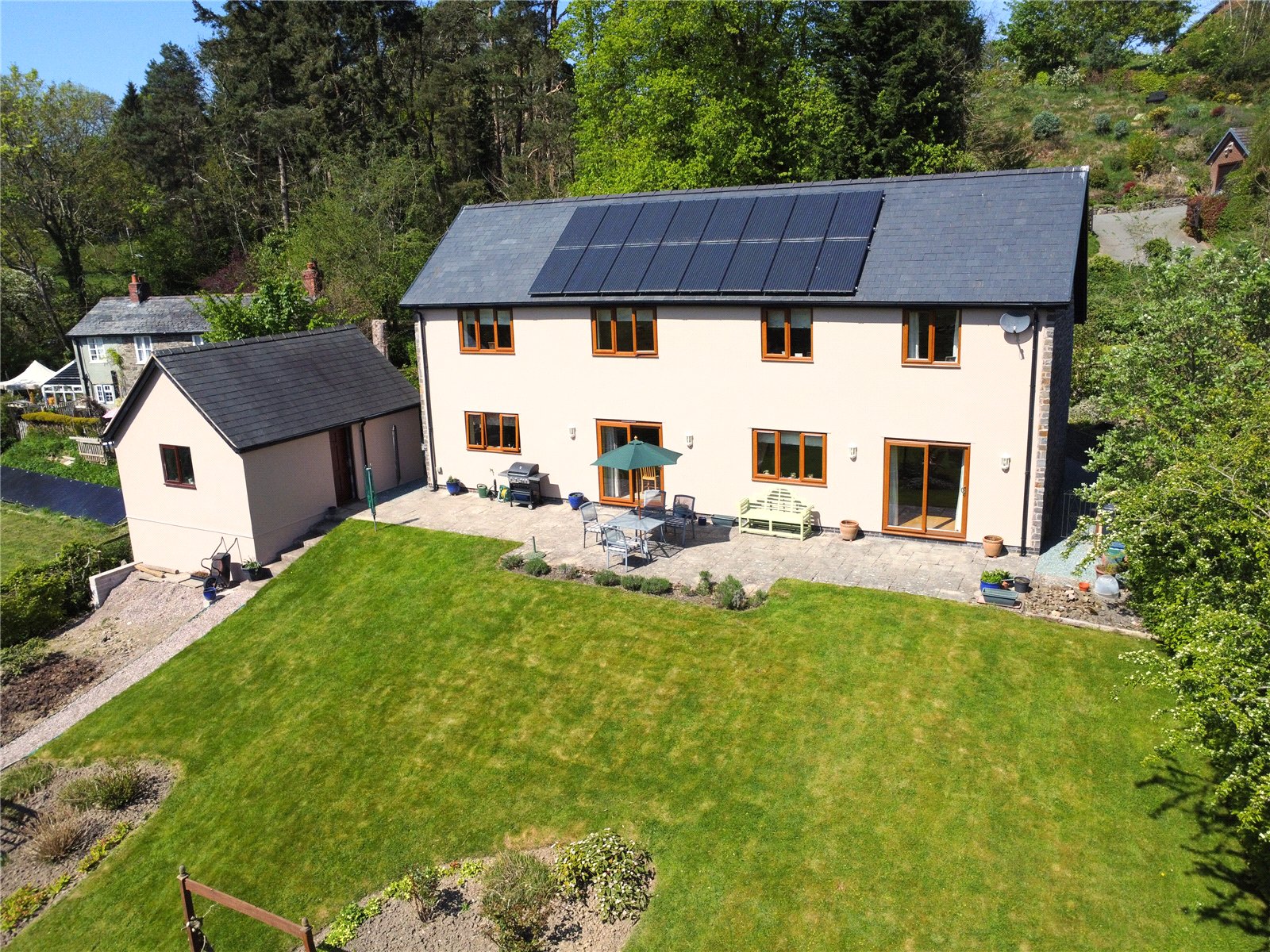- Ground source heating, fully double glazed, solar panels