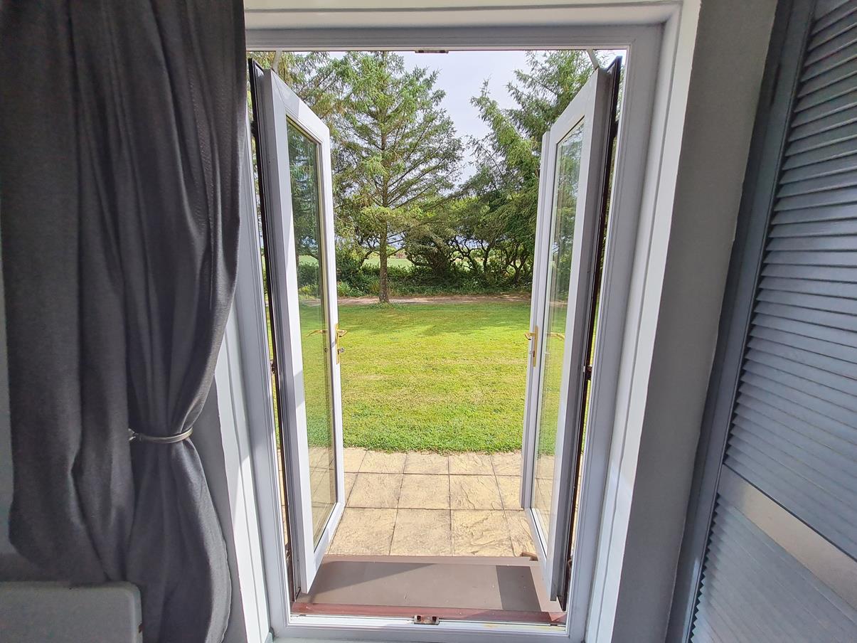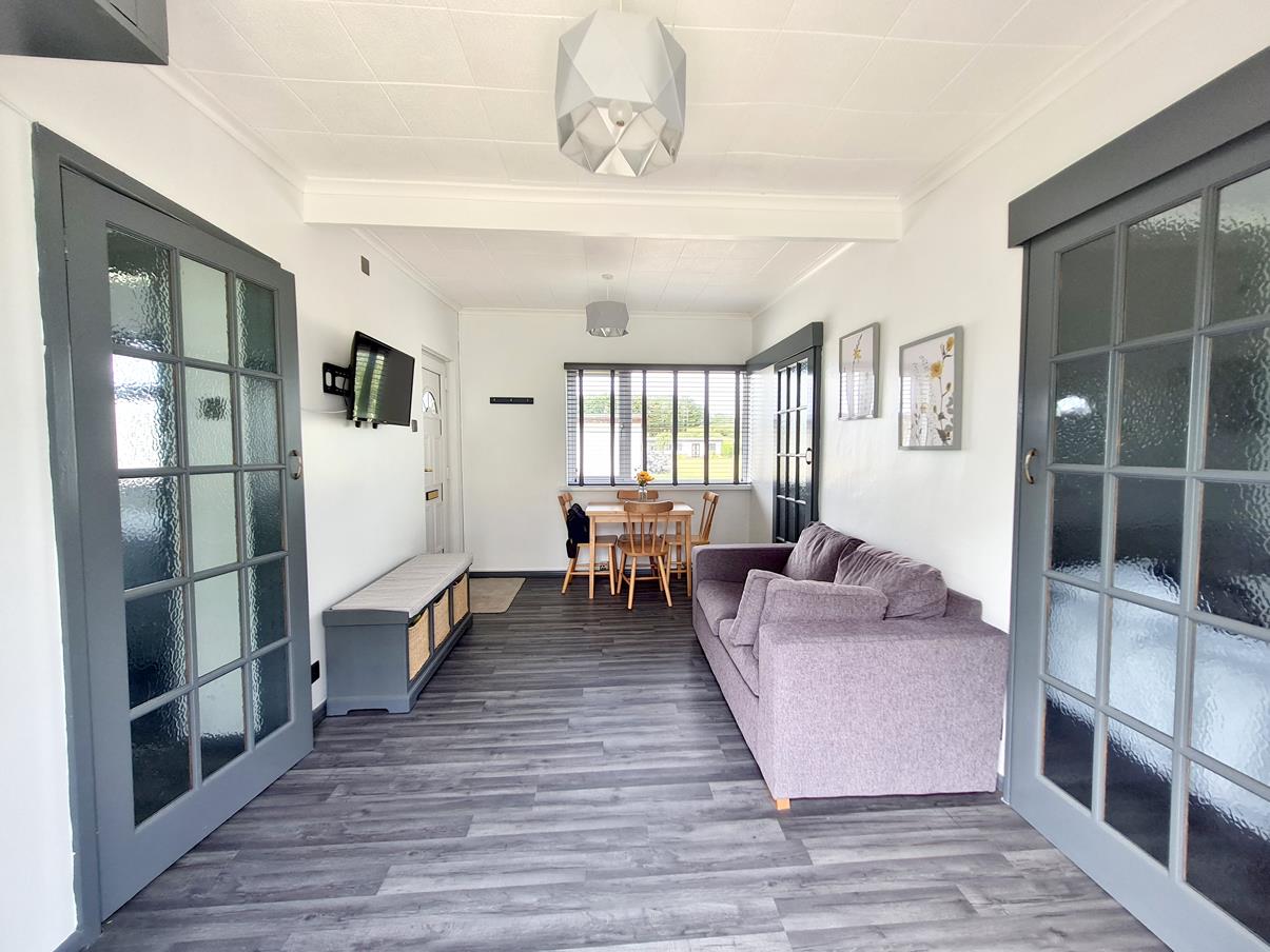 Open Plan Sitting / Dining Room - 4.70m x 2.77m (15'5 x 9'1) - A nicely presented dual aspect room enjoying a sunny aspect and a contemporary feel throughout. There are french doors leading out to the rear patio and lawned grounds, a window to the front aspect, an electric heater (portable), coat hanging space, louvred storage cupboards and overhead storage, sliding doors off to both bedrooms and an obscure glazed multi panel door to the