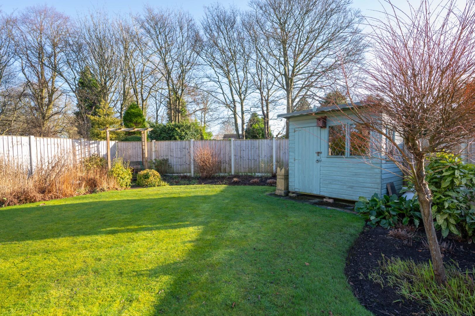 Outside, the front of the property offers a low-maintenance flagged garden and a driveway leading to a double garage with an electric door, all enclosed by an original stone-built boundary wall. The rear of the property presents a private garden with a lush lawn, a shed, and a spacious patio area, offering the added advantage of no direct overlooking.