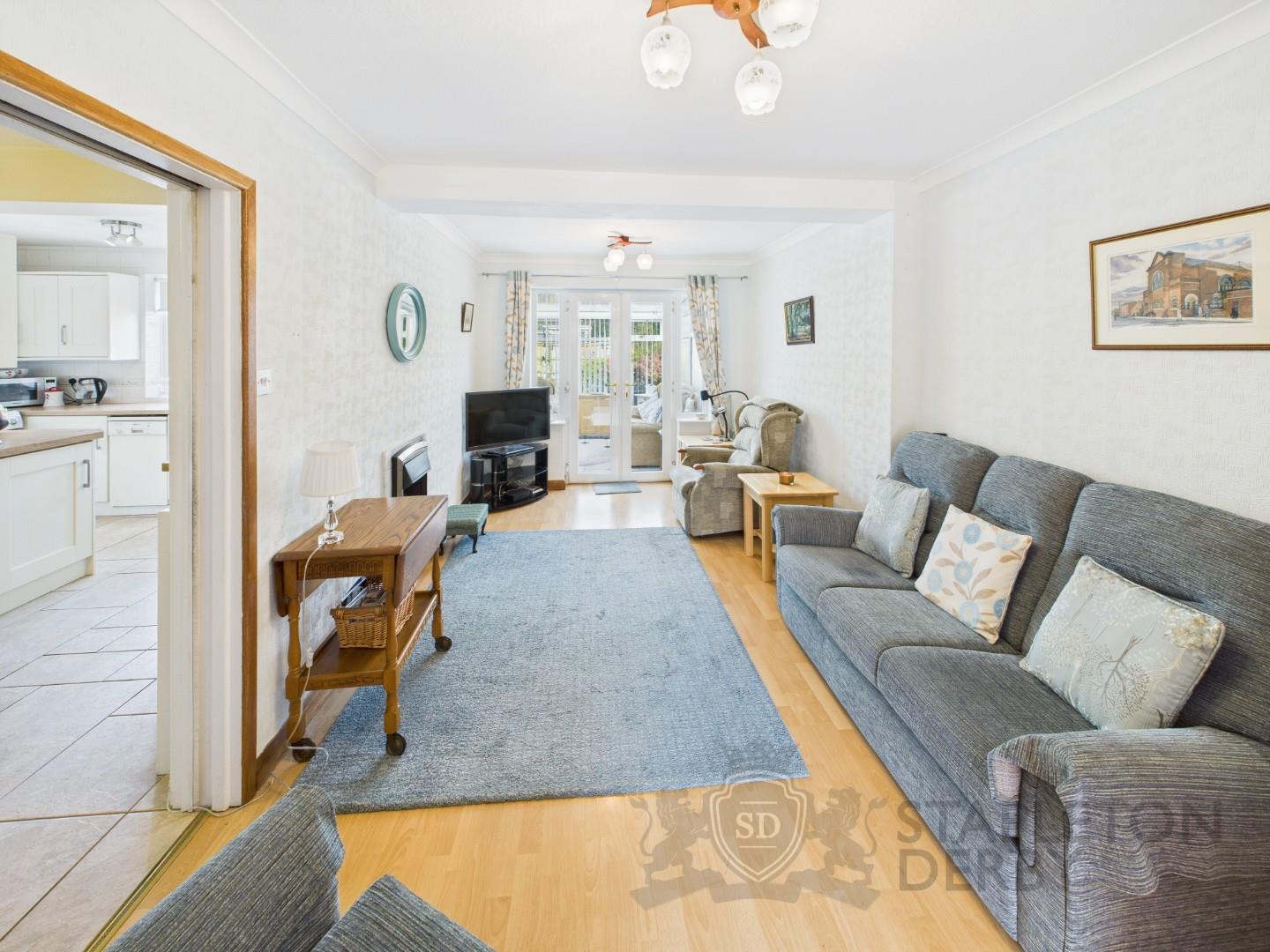 On the first floor, there are three well-proportioned bedrooms and a family bathroom. Externally, the property features off-road parking, lawn and garage access at the front, along with a generous garden and patio at the rear.