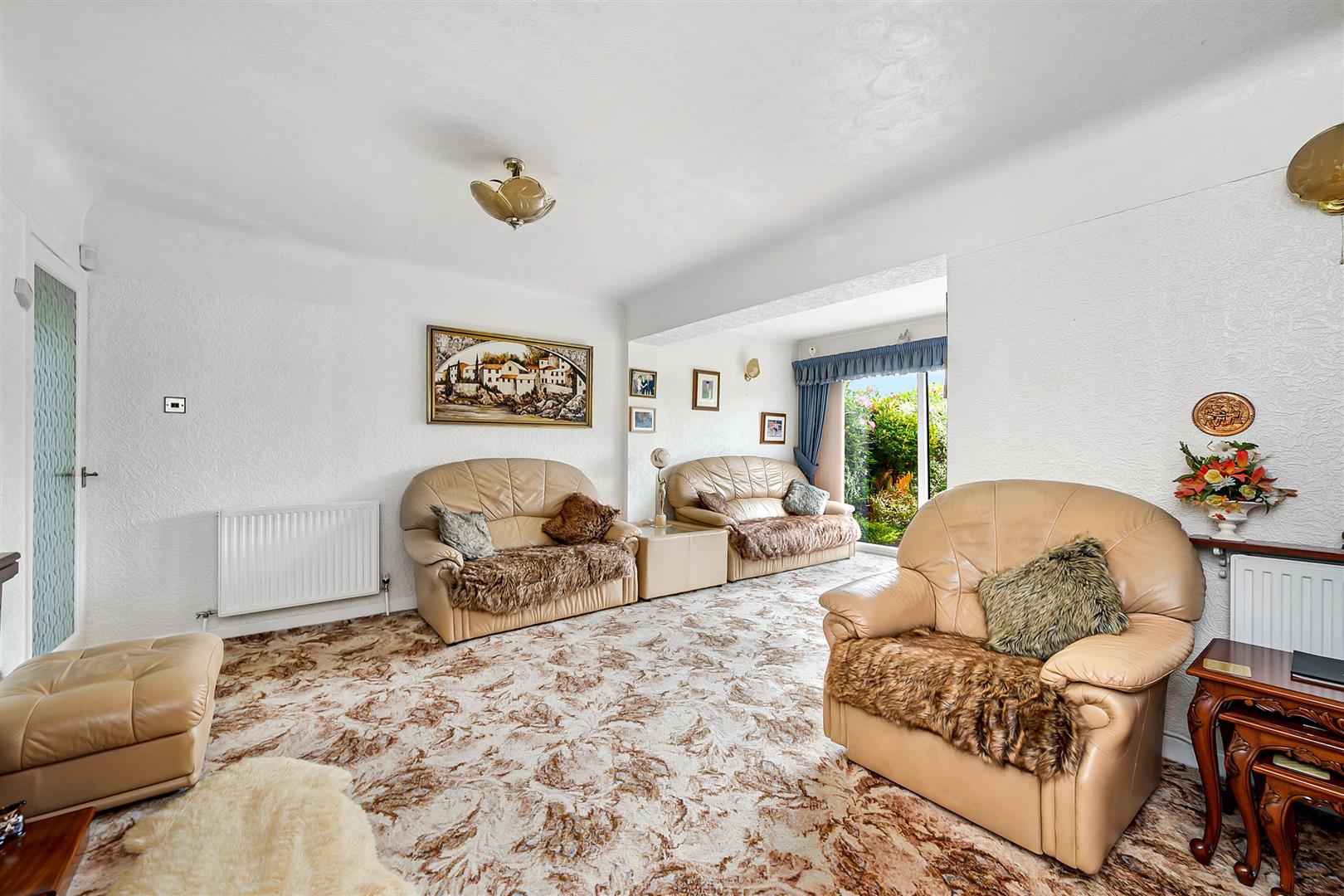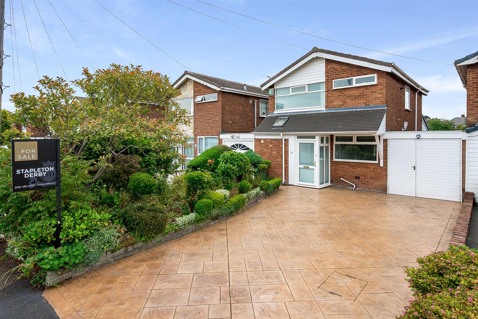 Externally large concrete imprinted front driveway and garden, garage with garden room to the rear.