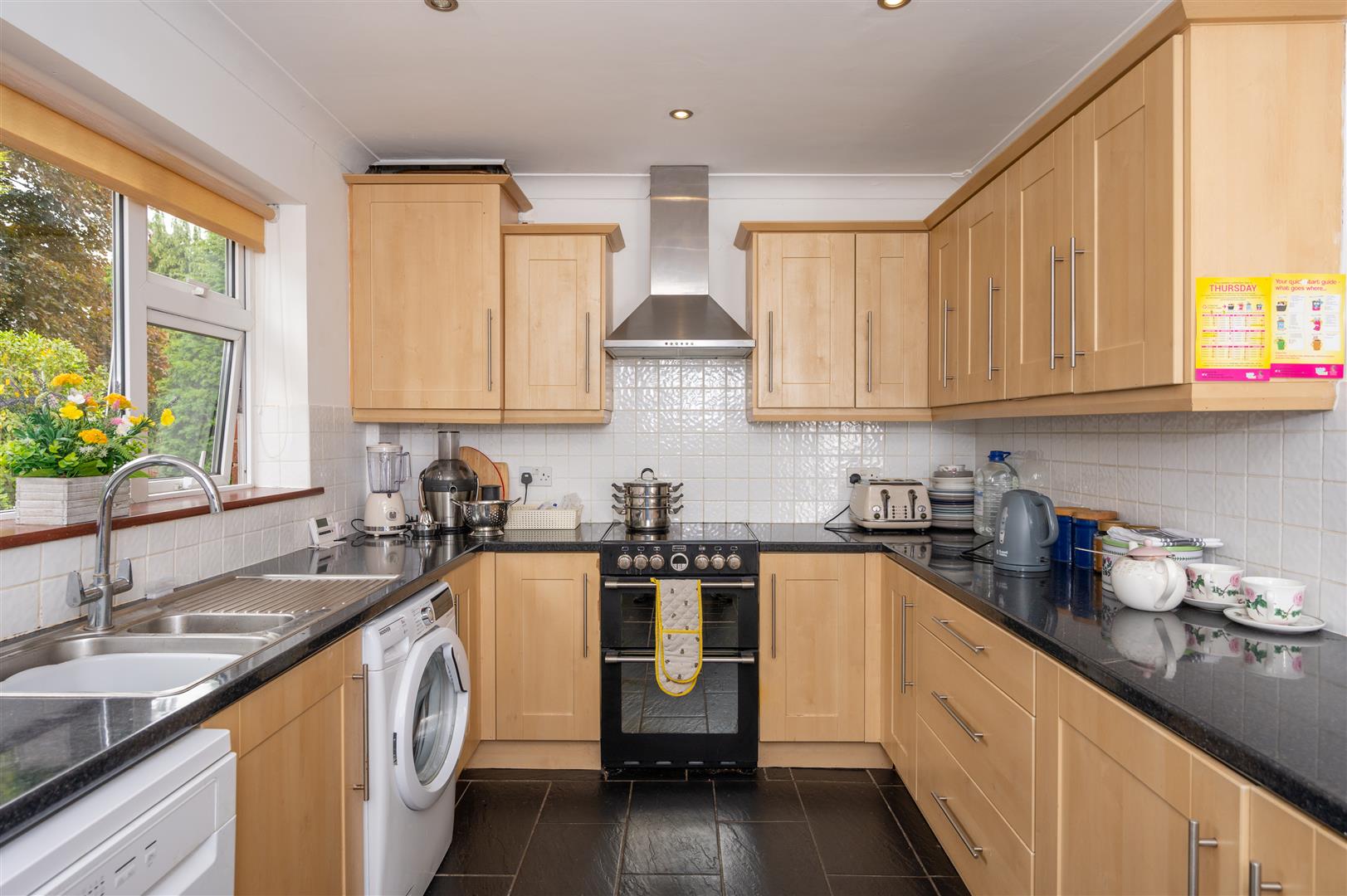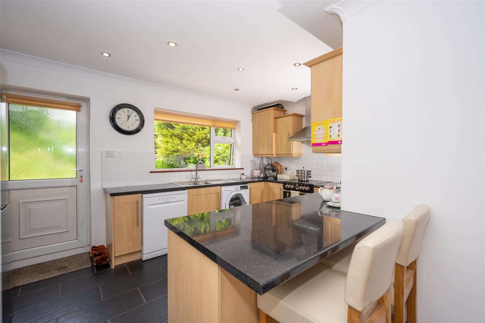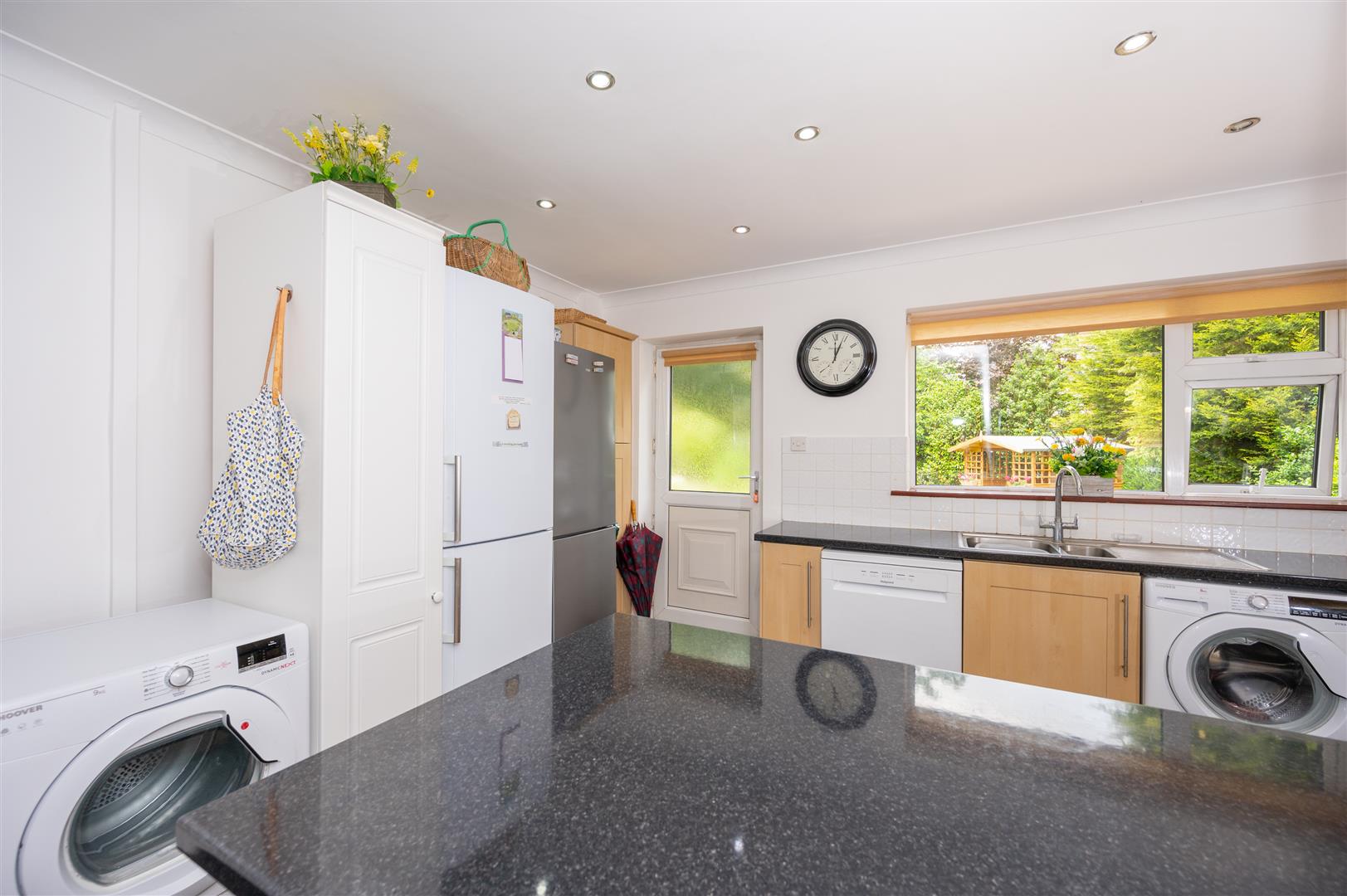 A range of wall and base units and work surfaces, double glazed window and double glazed door to rear, electric oven and hob with extractor fan over, space for dishwasher, fridge freezer, washing machine and dryer, Breakfast bar, part tiled walls and tiled flooring, stainless steel sink and drainer unit, spotlights to ceiling, space for dining table and chairs.