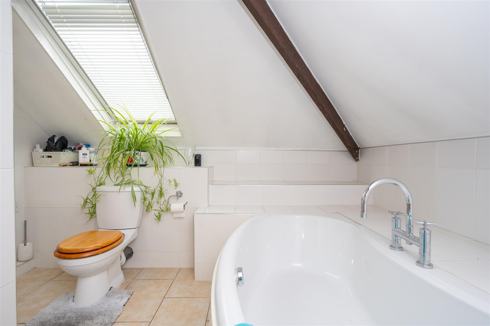 Large feature bath with central tap, shower cubicle and shower, pedestal wash hand basin and wc., exposed beams, limited head height, part tiled walls and tiled flooring, Velux window, loft access.
