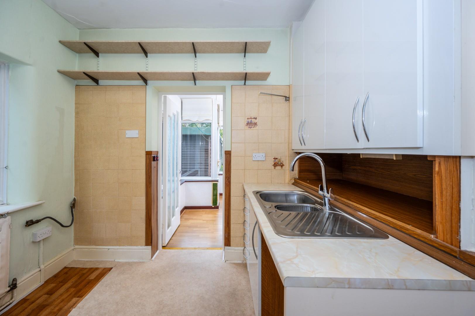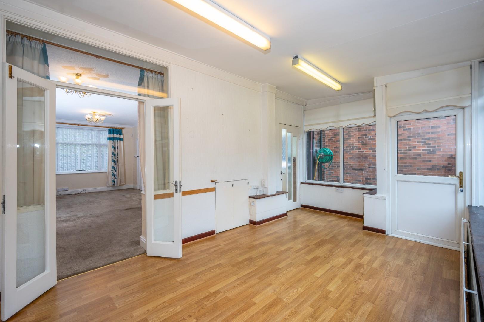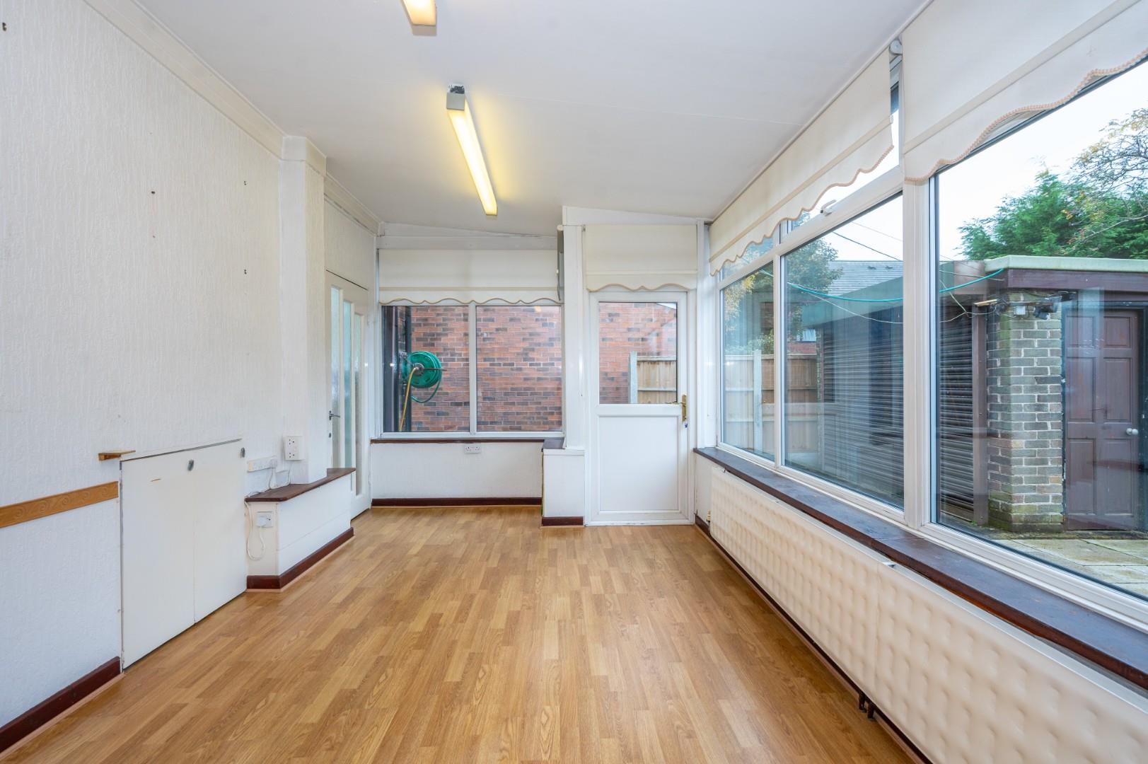 The property presents an opportunity for modernization and comprises a porch, a spacious open hallway, a downstairs WC, a connected living room, a kitchen, and a dining/conservatory area. The front of the property provides off-road parking and side access to the rear. At the back, there is a substantial garden and a detached garage.