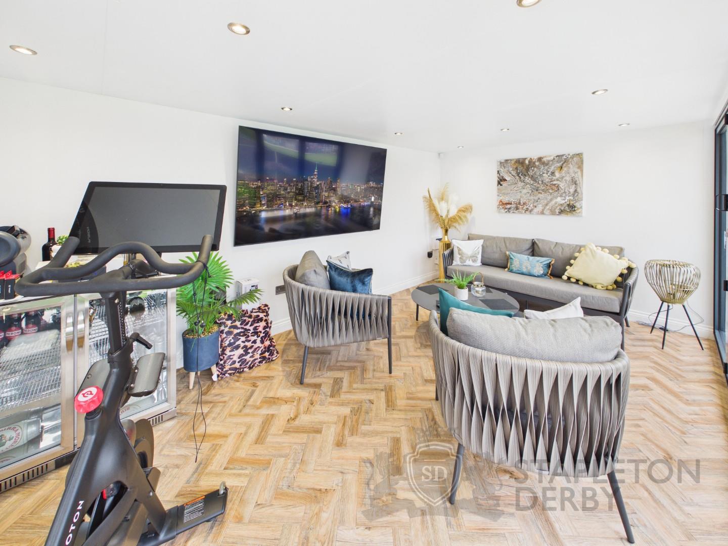 The property opens with a welcoming entrance hallway leading into a beautifully presented interior that has been thoughtfully decorated throughout. The living room is a standout feature, offering a stunning, elegant space for relaxation, complemented by a separate dining room ideal for entertaining. A dedicated study provides the perfect spot for home working. To the rear, the open-plan kitchen and dining area creates a sociable heart of the home, complete with a breakfast bar and an adjoining sunroom that floods the space with natural light. A cleverly concealed utility room and internal access to the garage add further practicality. The first floor offers four generous double bedrooms. One bedroom features an ensuite and walk-in wardrobe, while another benefits from its own ensuite, making the layout ideal for families or guests. Each room continues the home’s refined décor and sense of space. Externally, the property impresses just as much. The front provides off-road parking for multiple vehicles, a double garage and a neat lawn with side access to the rear. The rear garden is a true highlight: beautifully landscaped with a patio area and a high-end garden room fitted with the latest technology and premium furnishings, creating an exceptional additional living or leisure space. The home also benefits from an EV charging point and CCTV for added convenience and security.
