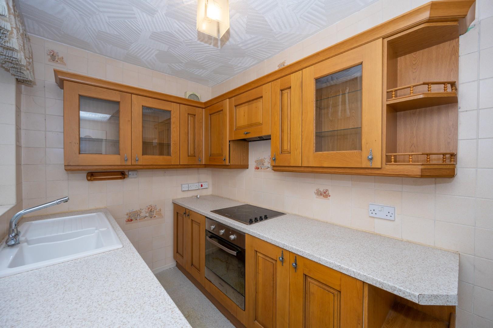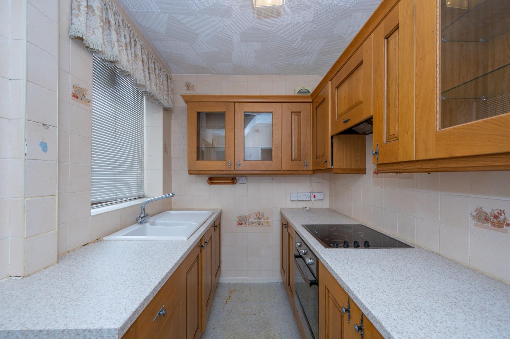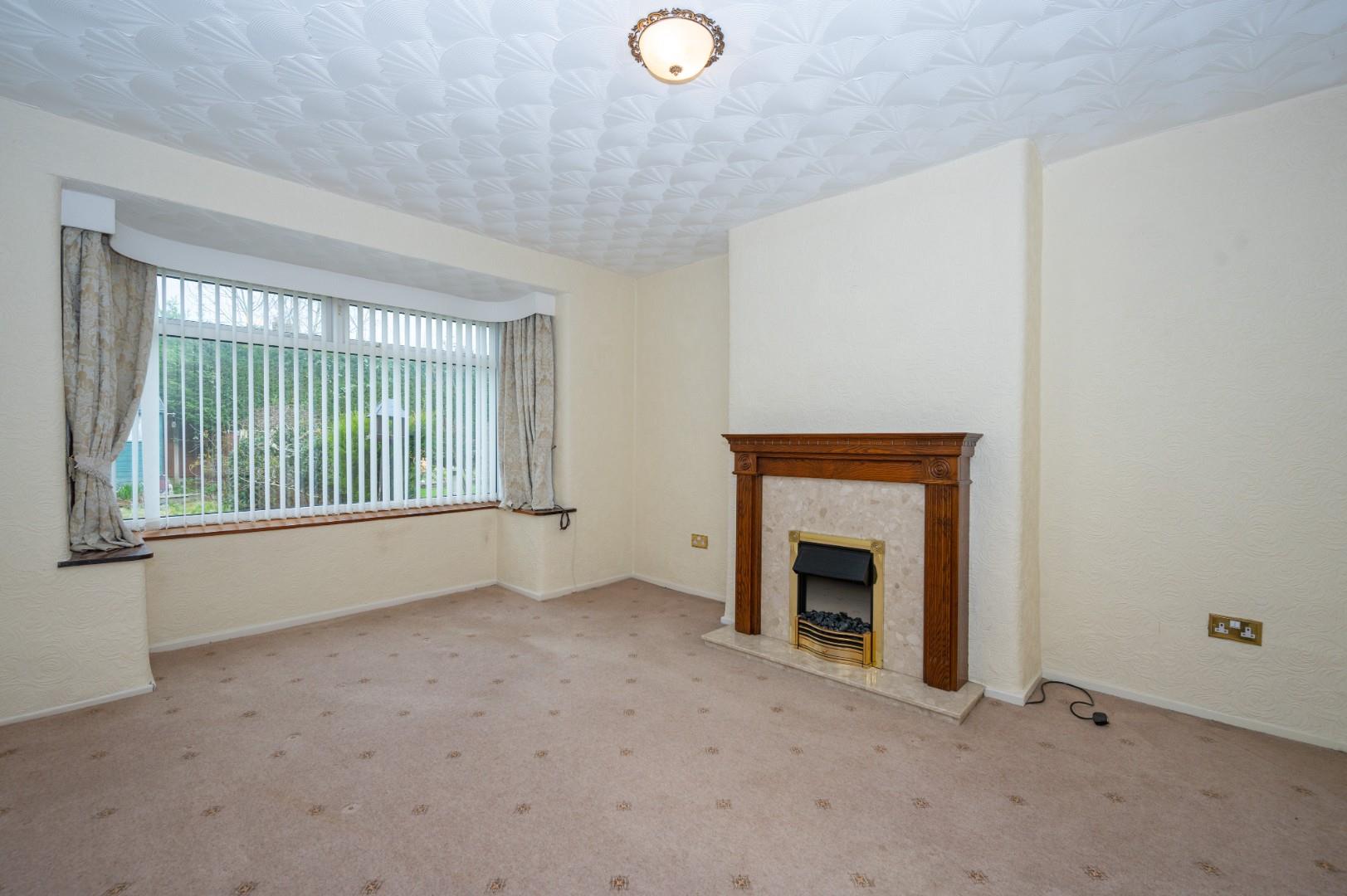 The property briefly comprises entrance hall, front lounge with fireplace and fire, rear lounge with feature fire surround and fire, kitchen with a range of wall and base units.