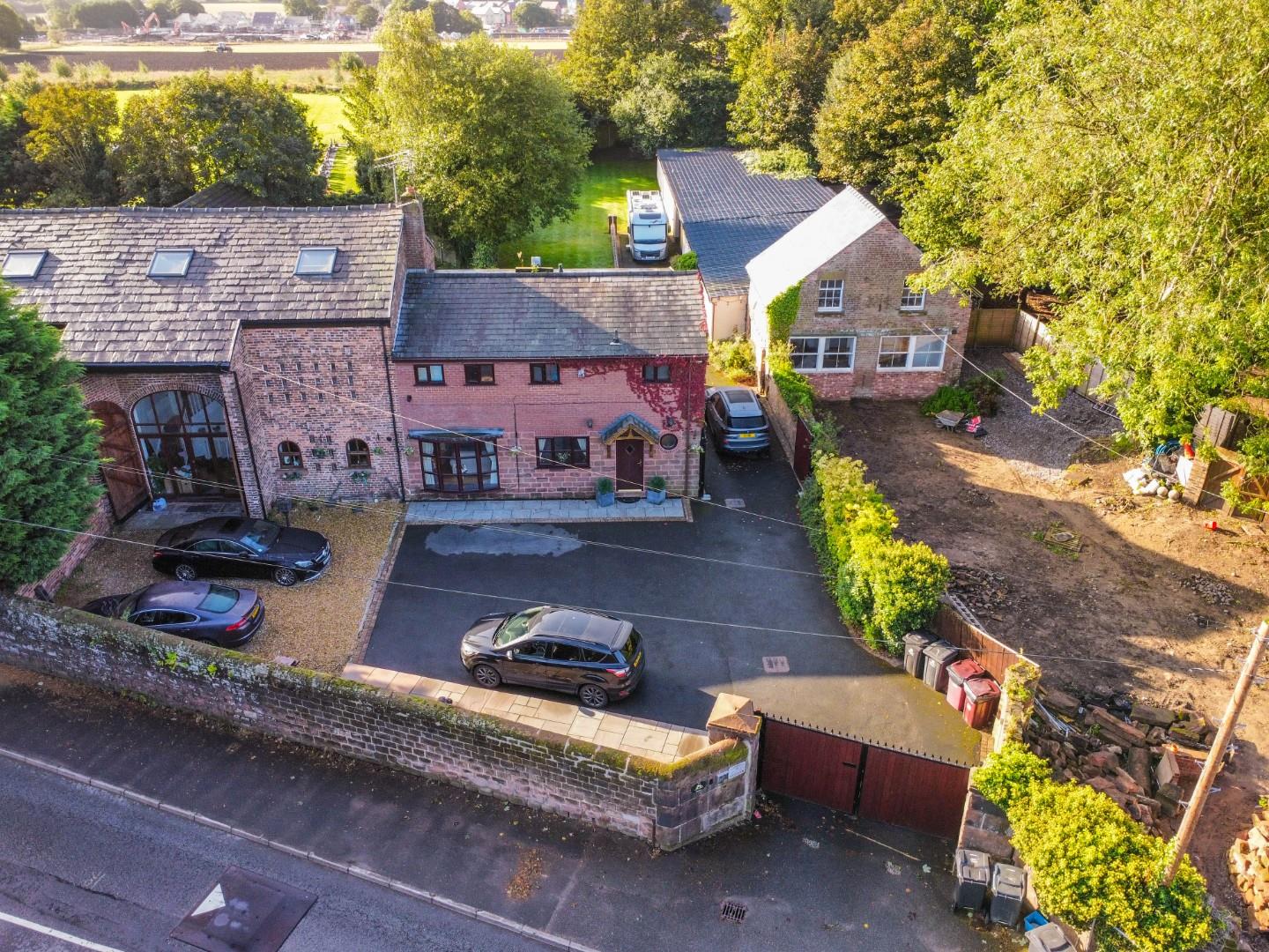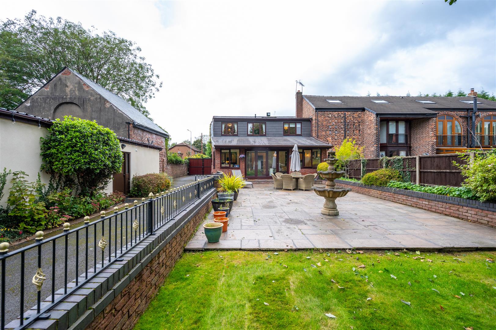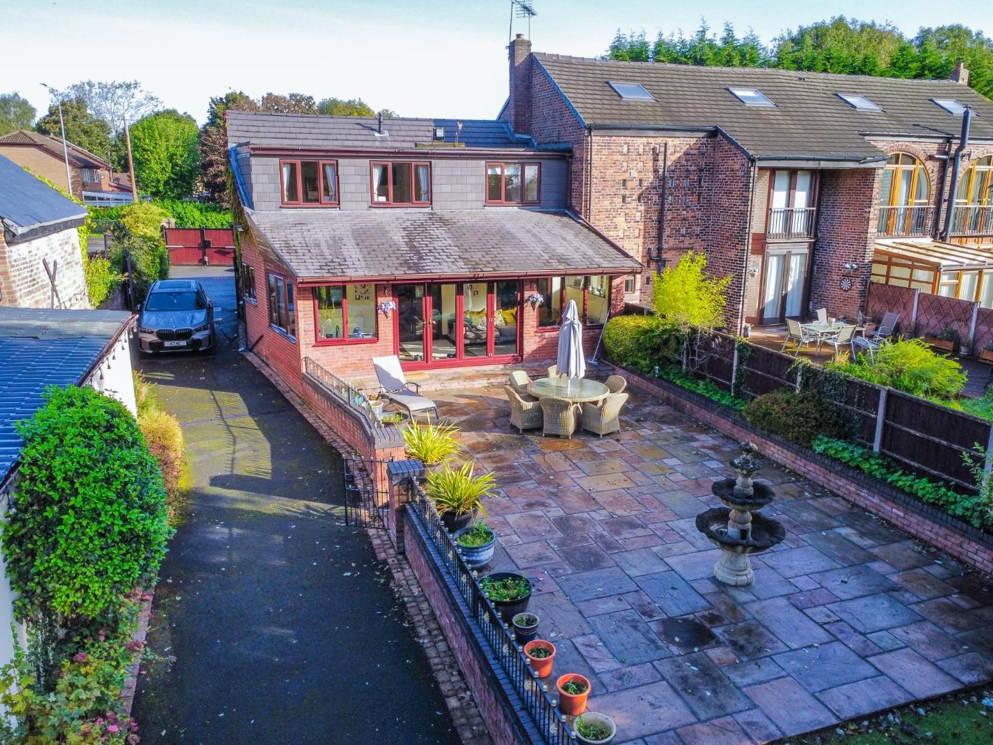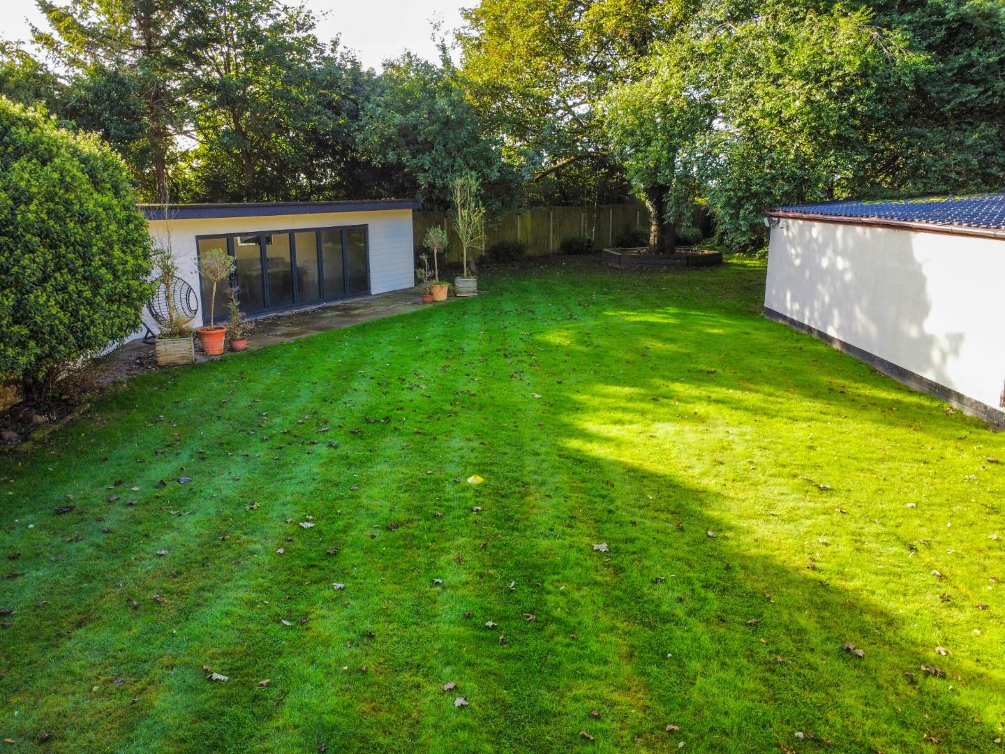 Externally, the property is cocooned in privacy, accessible through electric gates discreetly concealed behind a six-foot sandstone wall. This entrance leads to a private driveway providing ample parking space and access to the expansive outbuildings; the outbuilding has separate access entrance, utilities, plumbing, electricity supply and toilet. The rear of the property showcases an expansive landscaped garden and a charming garden room.