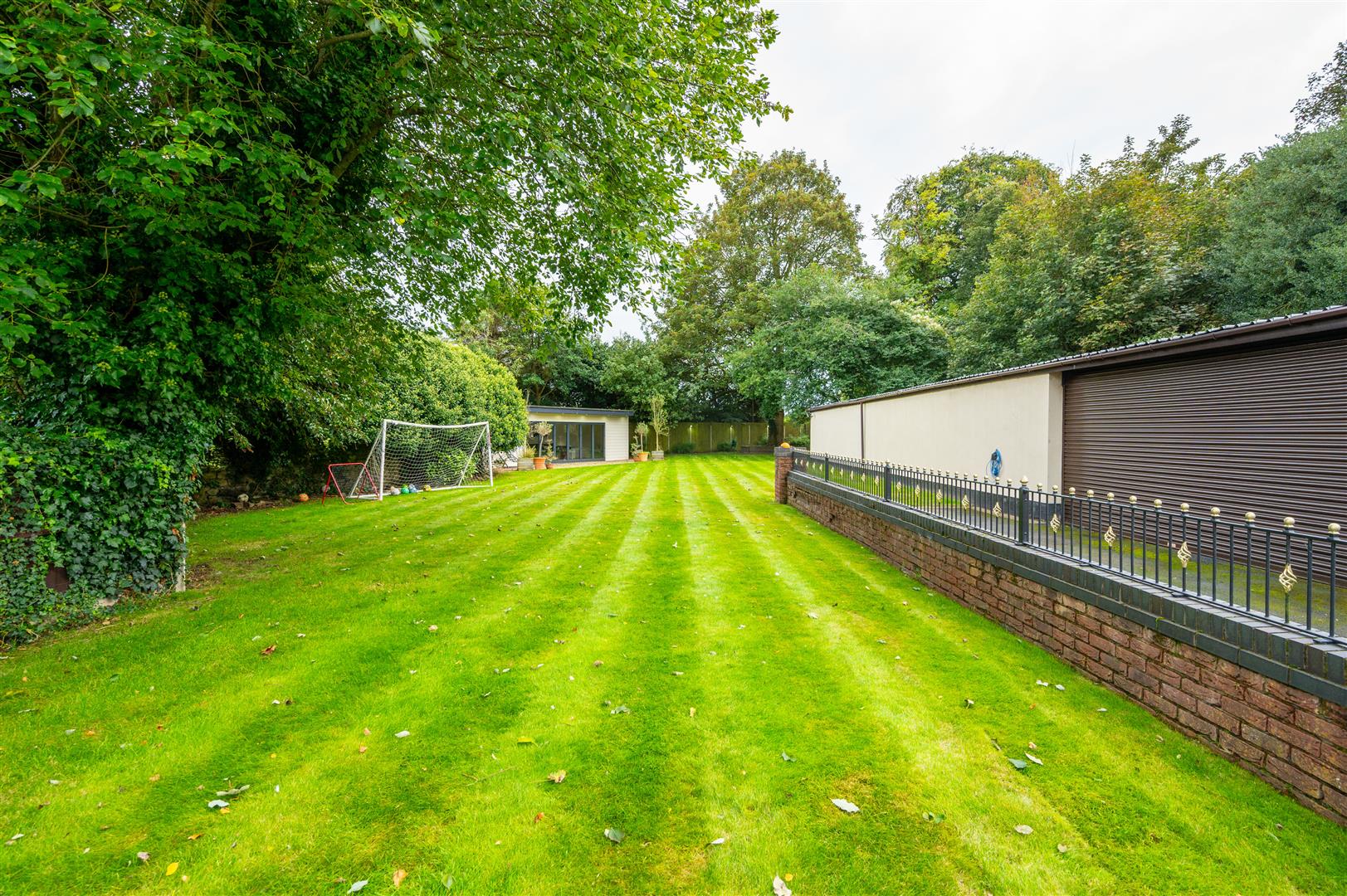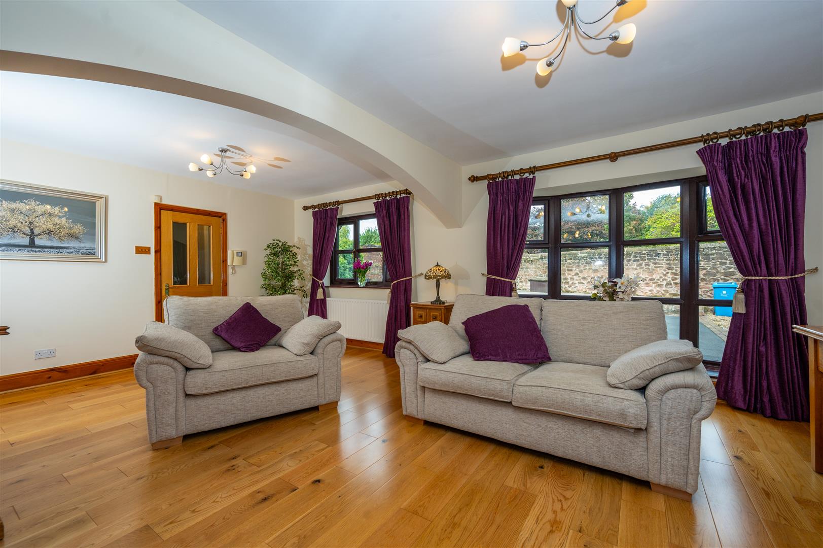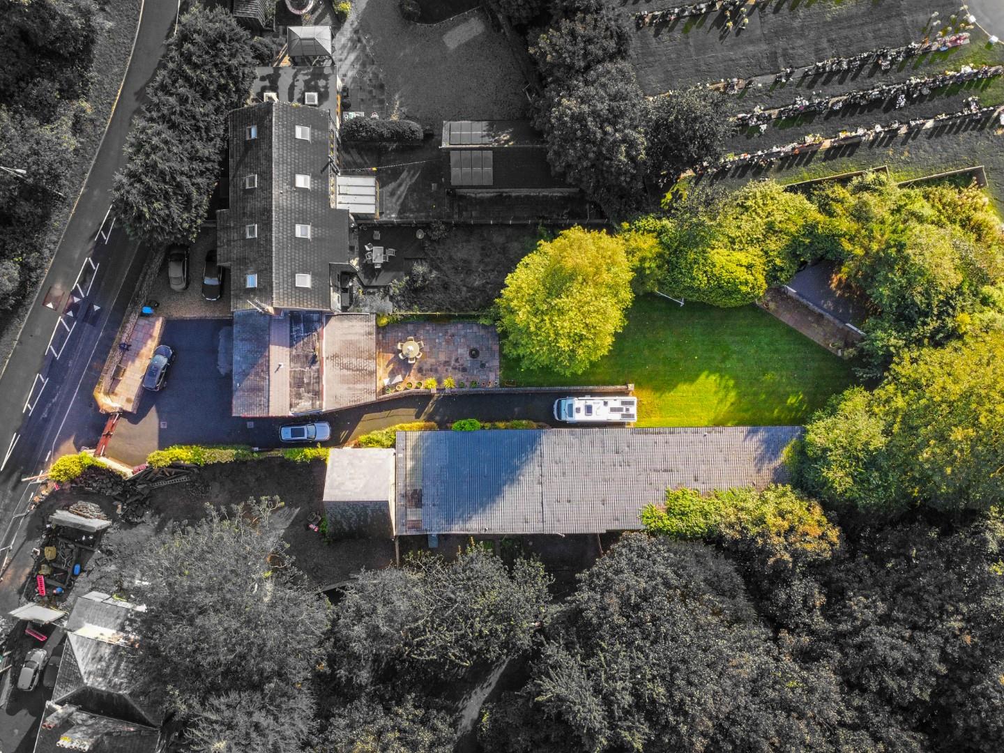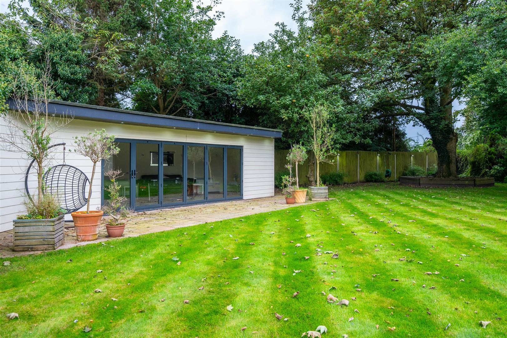 Externally, the property is cocooned in privacy, accessible through electric gates discreetly concealed behind a six-foot sandstone wall. This entrance leads to a private driveway providing ample parking space and access to the expansive outbuildings; the outbuilding has separate access entrance, utilities, plumbing, electricity supply and toilet. The rear of the property showcases an expansive landscaped garden and a charming garden room.