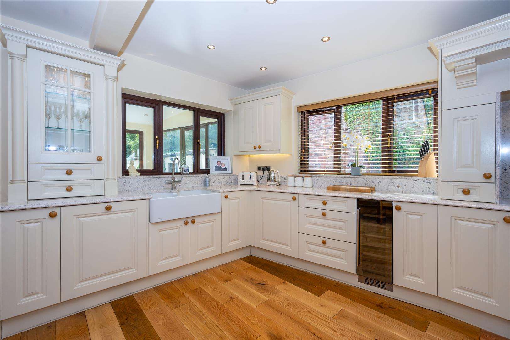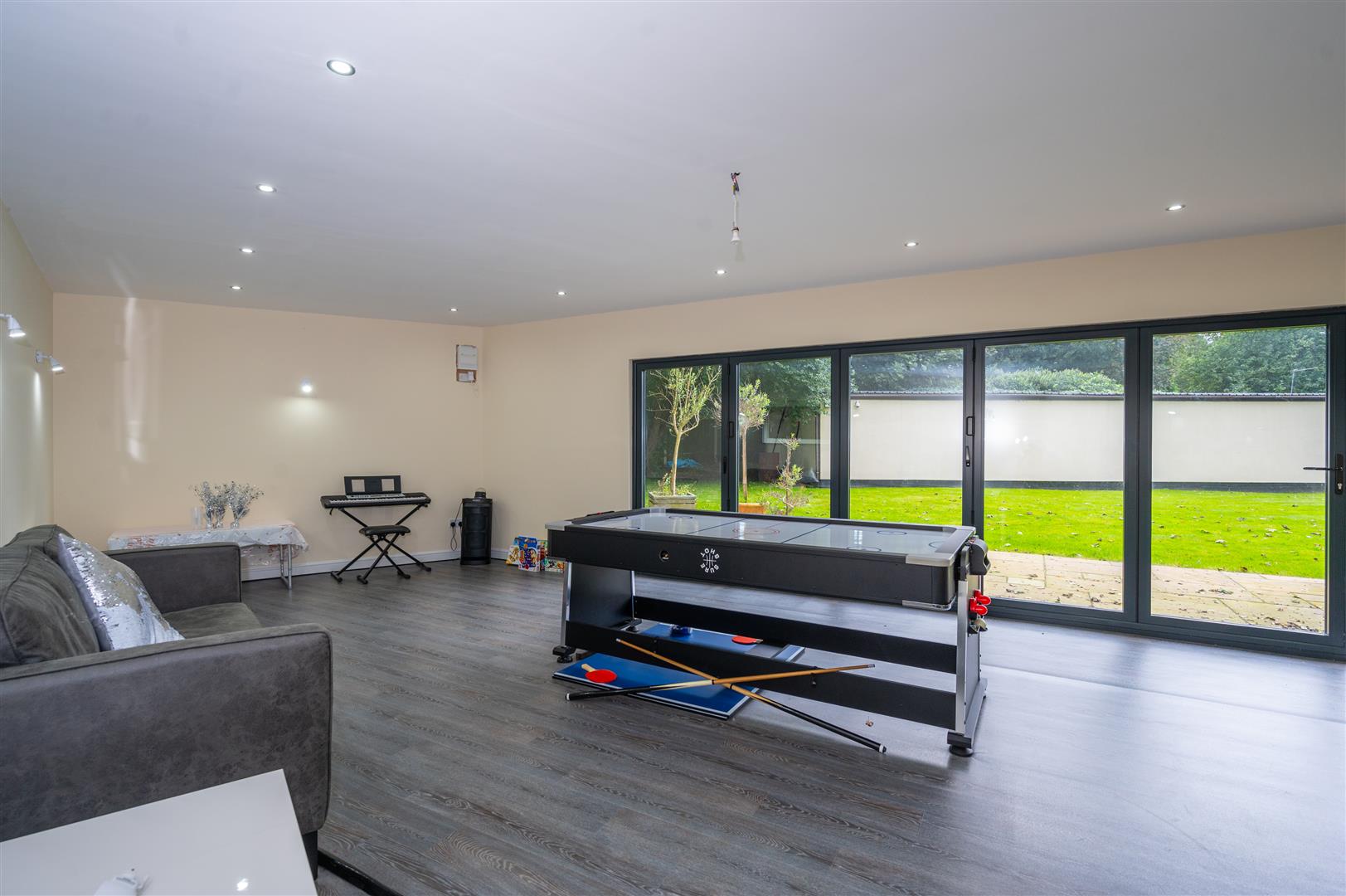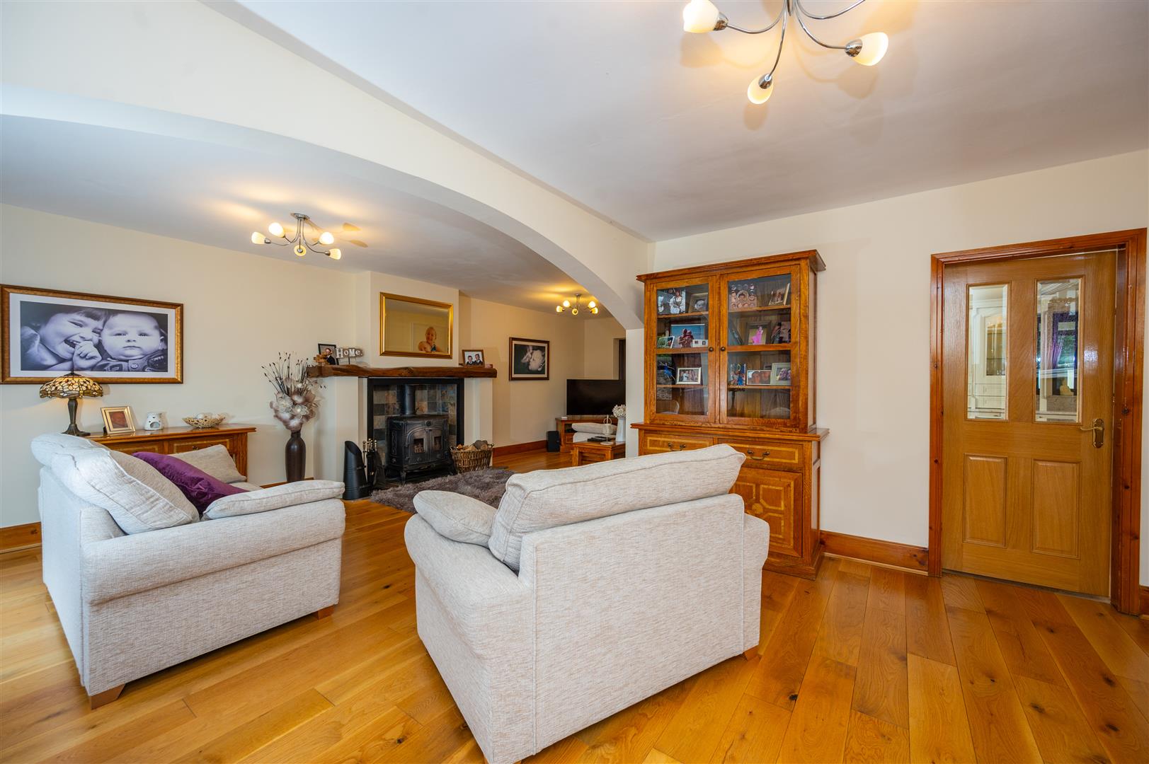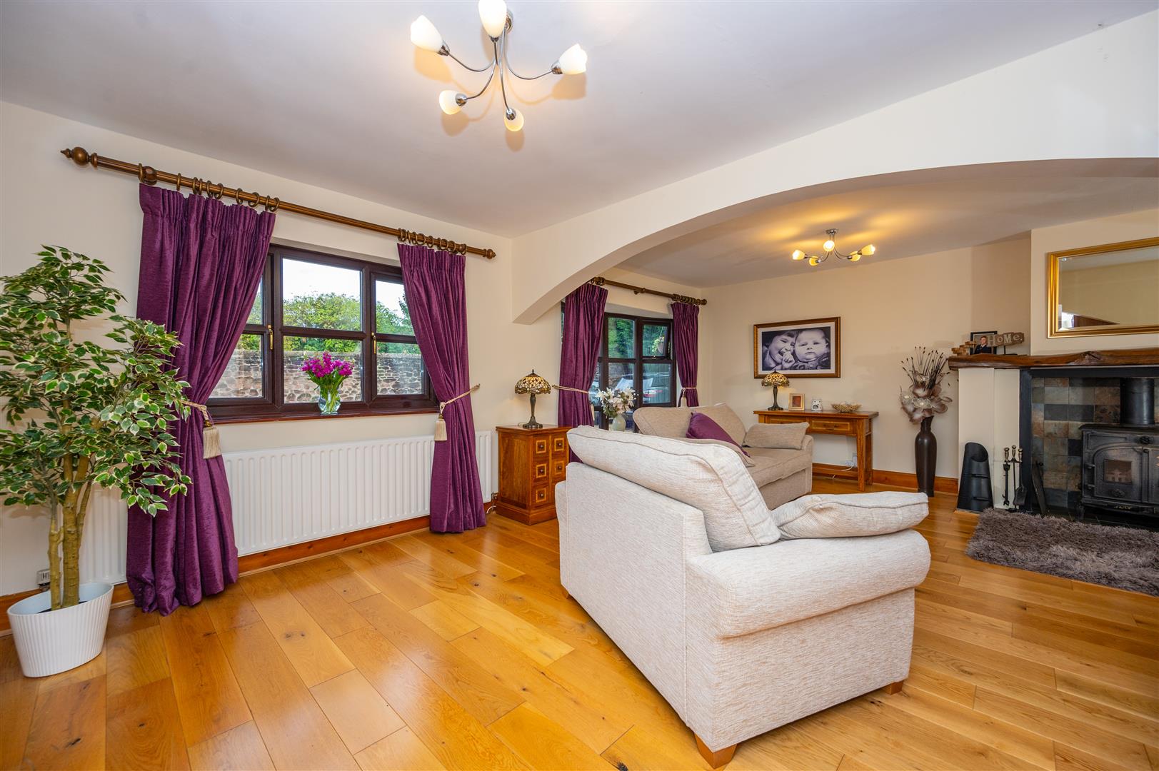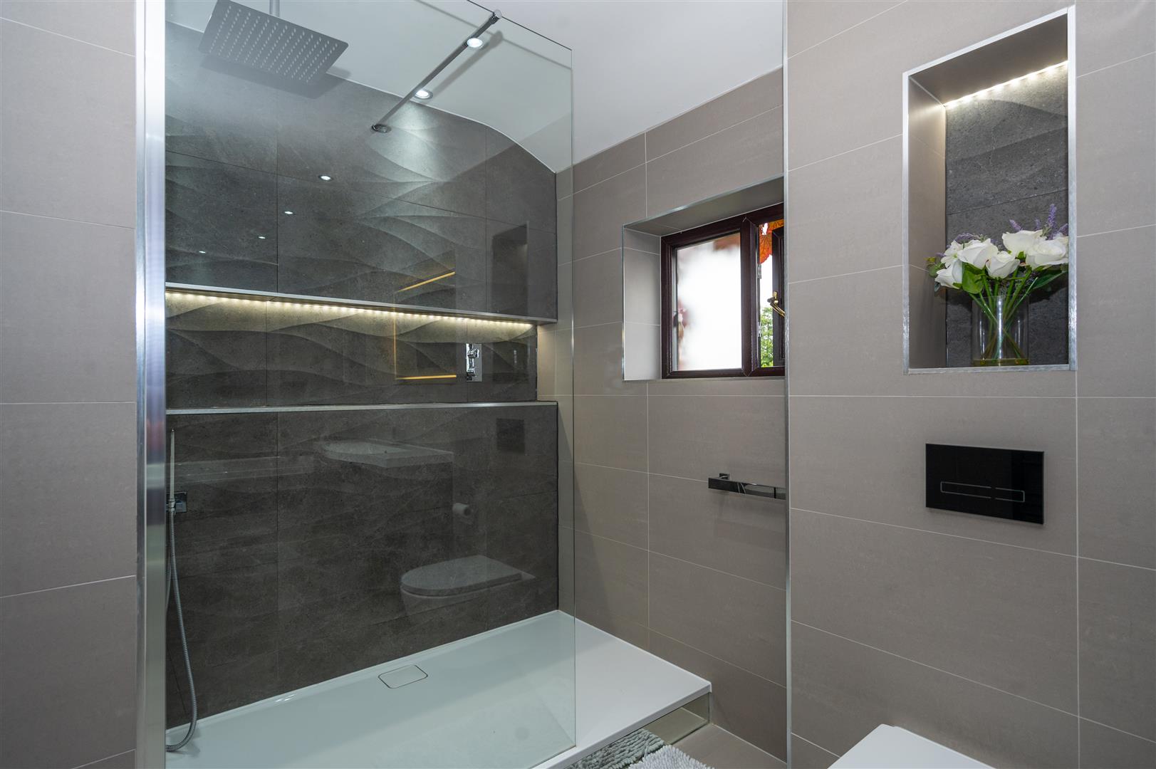 Externally, the property is cocooned in privacy, accessible through electric gates discreetly concealed behind a six-foot sandstone wall. This entrance leads to a private driveway providing ample parking space and access to the expansive outbuildings; the outbuilding has separate access entrance, utilities, plumbing, electricity supply and toilet. The rear of the property showcases an expansive landscaped garden and a charming garden room.