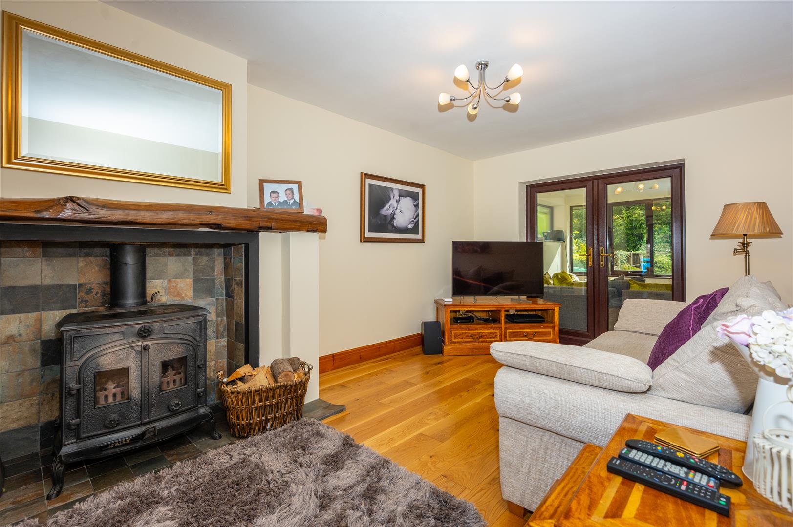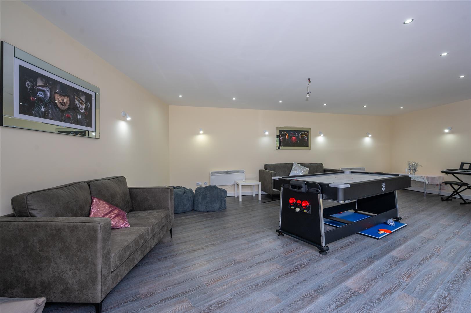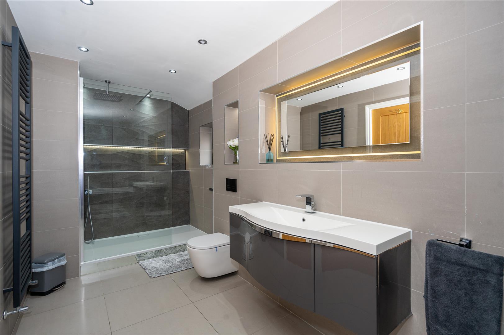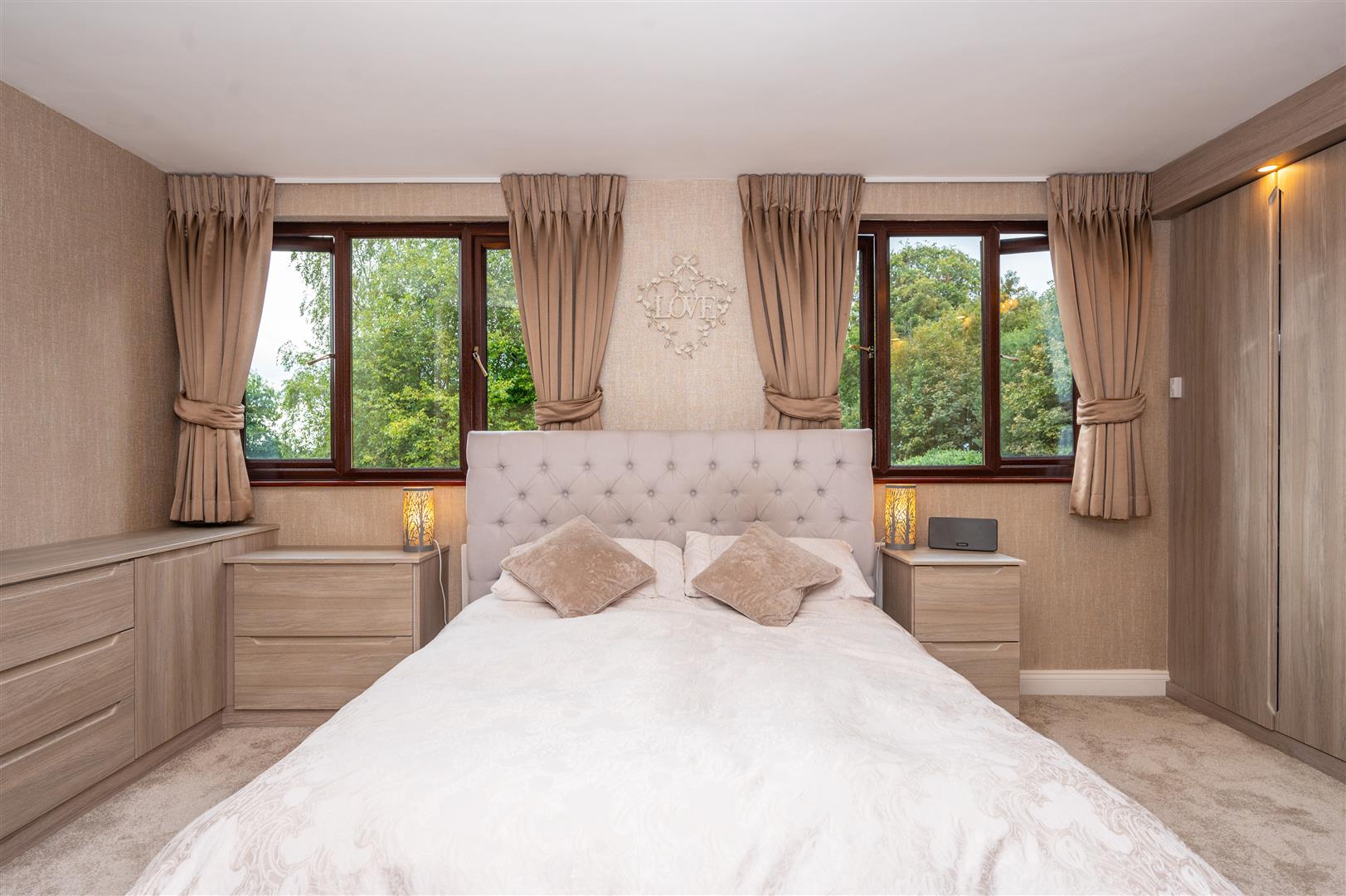 Externally, the property is cocooned in privacy, accessible through electric gates discreetly concealed behind a six-foot sandstone wall. This entrance leads to a private driveway providing ample parking space and access to the expansive outbuildings; the outbuilding has separate access entrance, utilities, plumbing, electricity supply and toilet. The rear of the property showcases an expansive landscaped garden and a charming garden room.