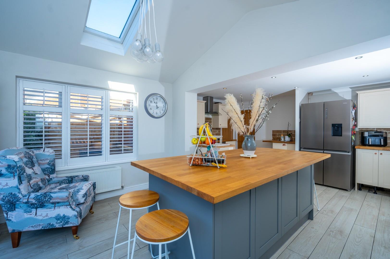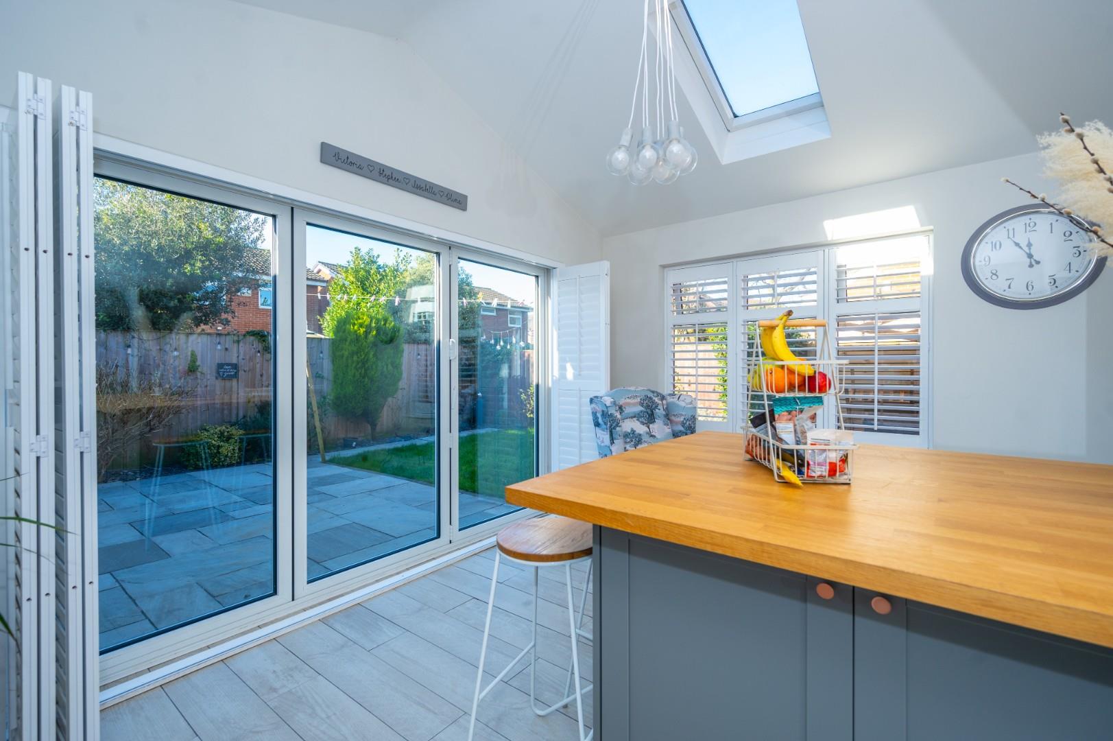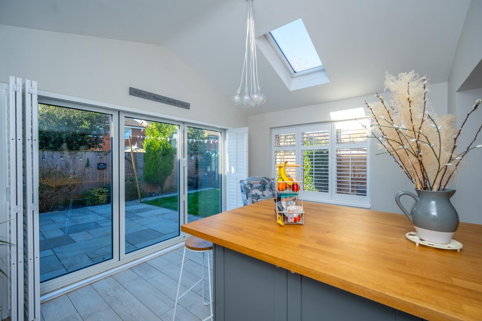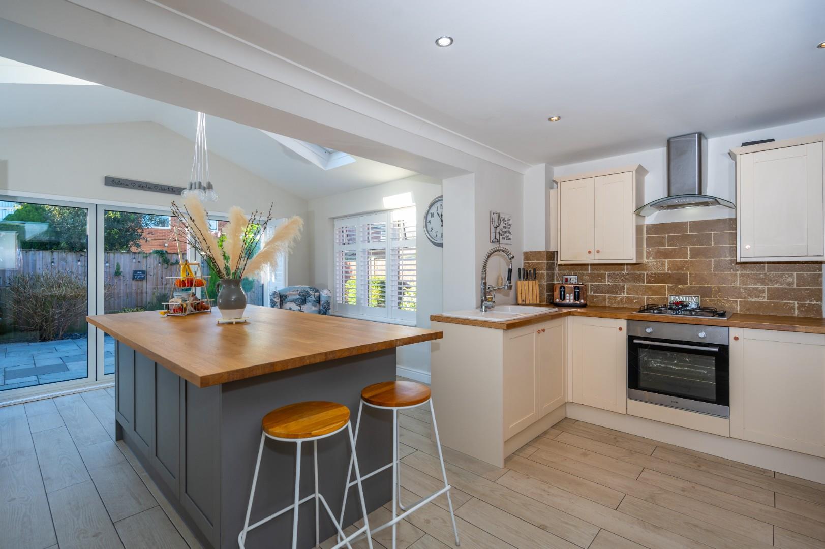 This remarkable property boasts an entrance hall/porch, a spacious living room, dining room, a small utility, a stunning open-plan kitchen area with an island, vaulted ceiling, modern window shutters, and bi-folding doors. The first floor encompasses three generously sized bedrooms, one with an en suite, and a family bathroom; conversion of the ensuite to bedroom 1 could form a fourth bedroom.