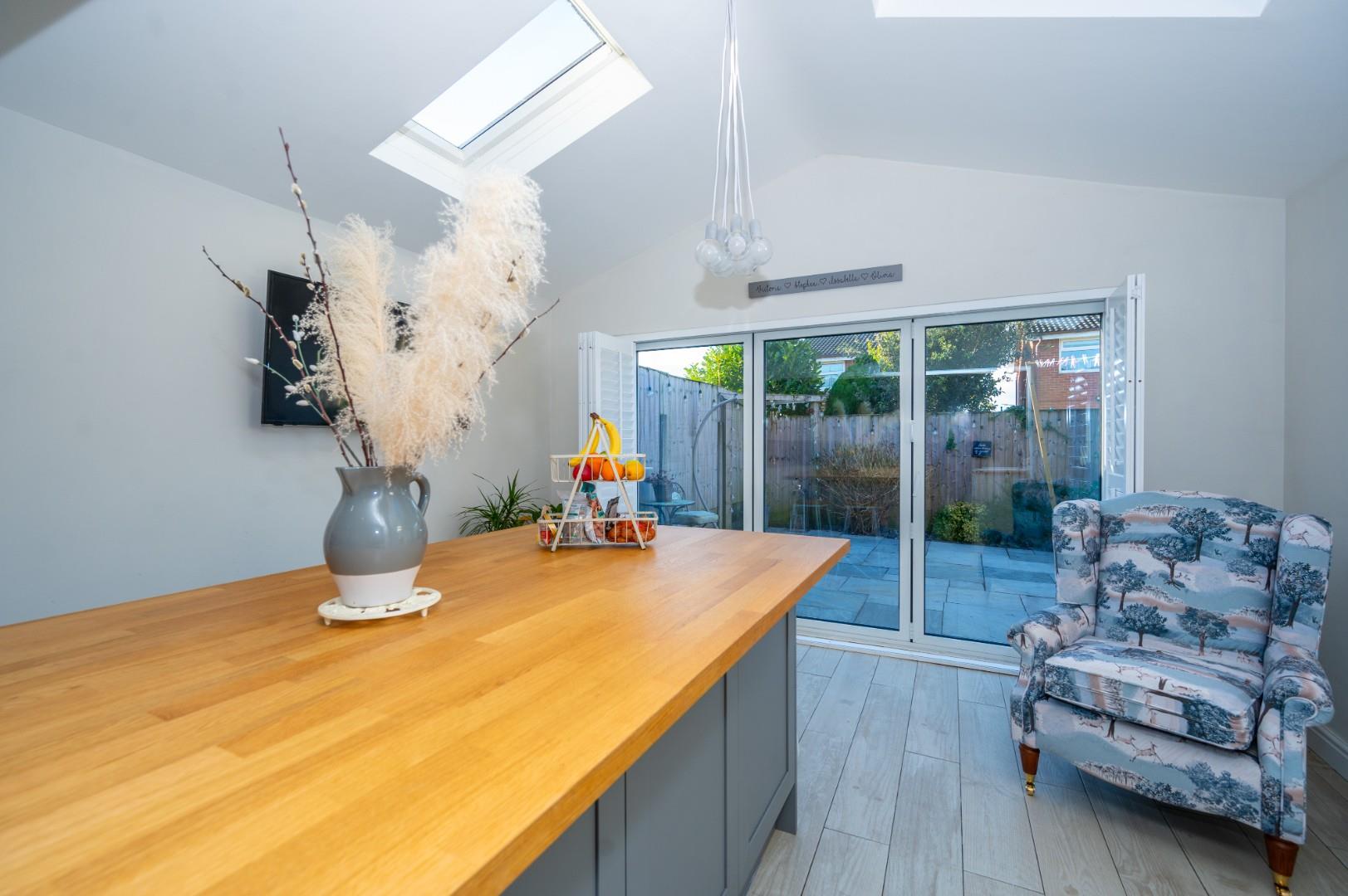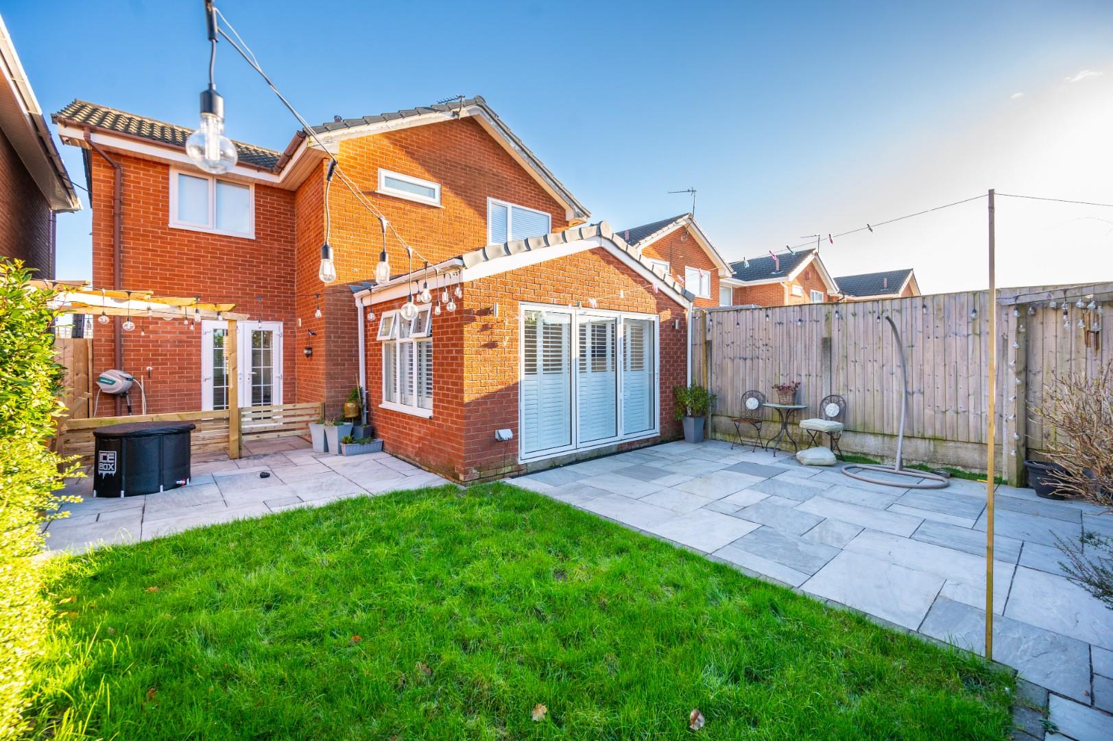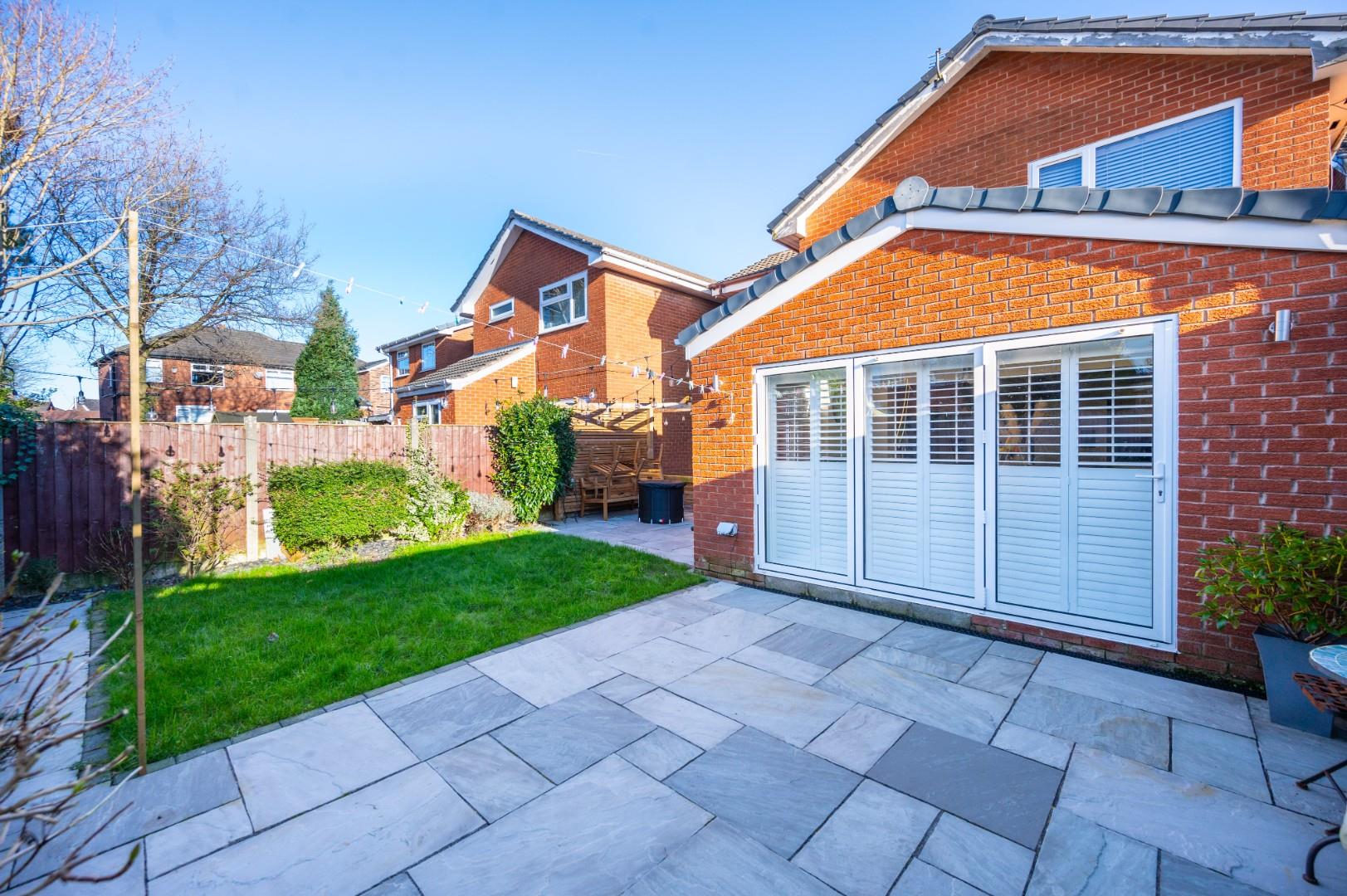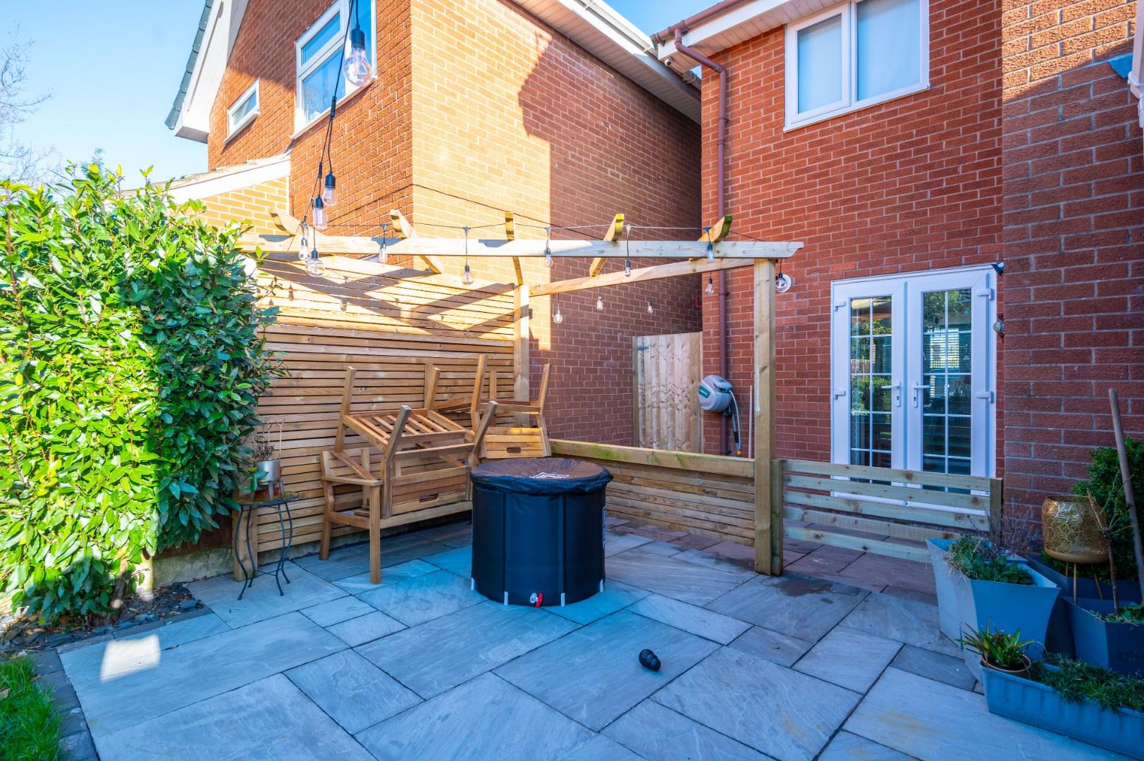 At the front, there is off-road parking and a lawn area, set within a contemporary frontage. The rear of the property features bi-folding doors that open onto a well-presented patio area, lawn, and entertaining space with a pergola.