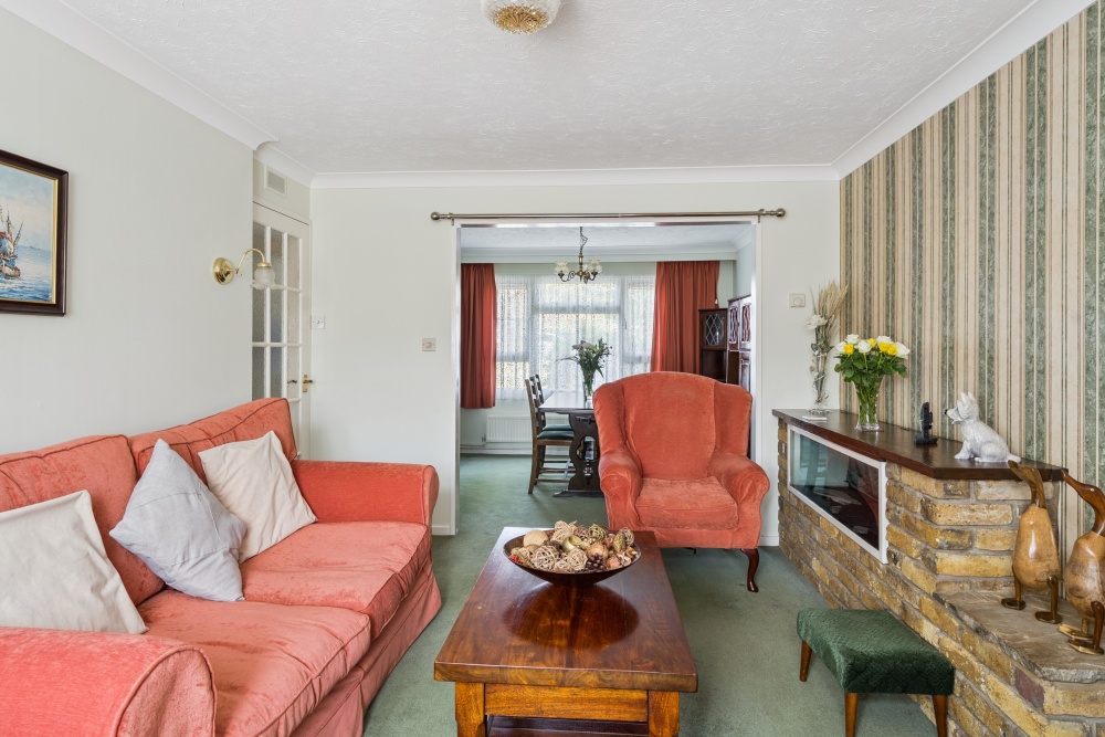 The door to the dining area is opposite the staircase and has a tall picture window to the front and a broad opening through to the living area which has a matching window overlooking the garden and a decorative, old-stock-brick, display plinth with storage niches, and a door to the hall.