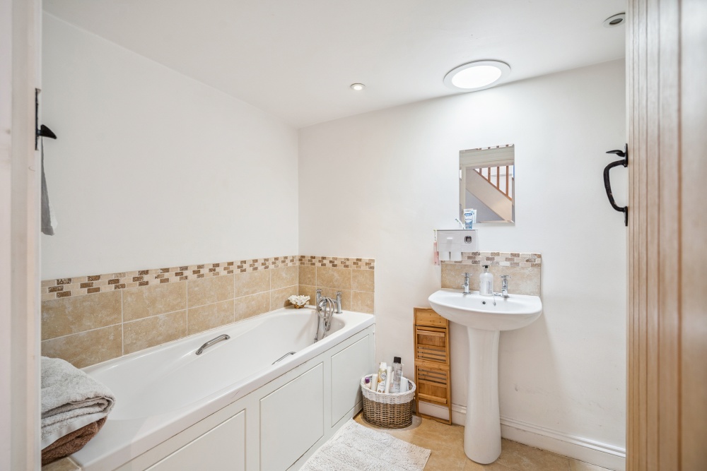 The staircase leads up to the first floor with the principle bedroom on the right overlooking the front and bedrooms 3 and 4 having views across the garden to the rear. It would be possible to knock through to form one larger bedroom should that be required. The family bathroom is fitted with a white suite, with natural light being provided by means of a sun tube.