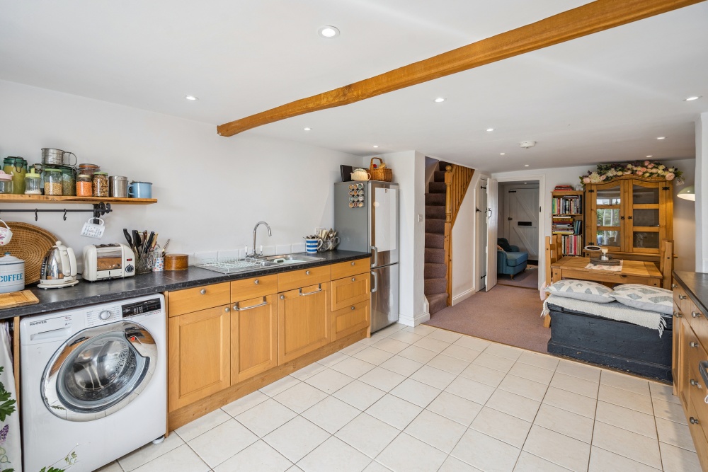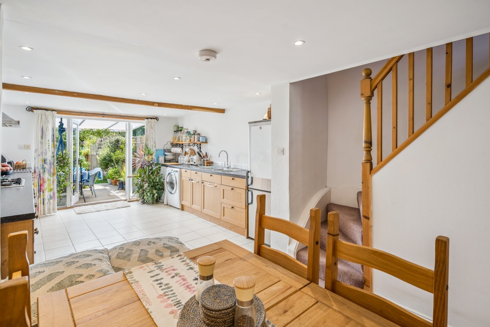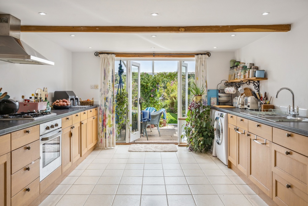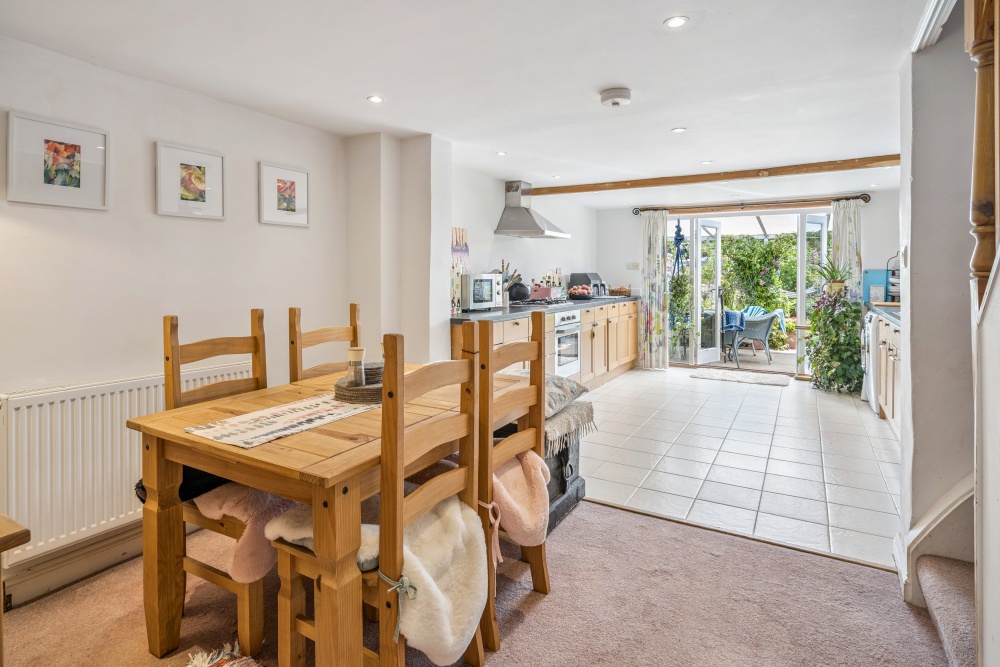 The front door opens directly into the living room which has a log burner in an attractive fireplace. A door from the living room leads to the extended kitchen-dining room. The dining area is in the centre of the house with stairs to the first floor and the kitchen is at the far end with French doors to the garden. The kitchen is fitted with a range of beech, Shaker-style, kitchen units wit
