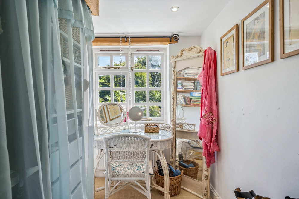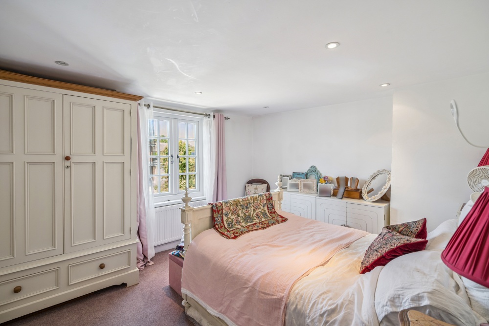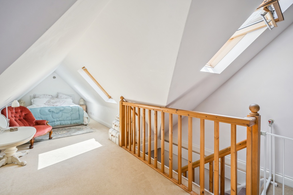 A further staircase leads up to the attic bedroom which is an L-shape. Currently the double bed is located at the end of the pitched roof (some restricted head height) leaving the other end available as a study/playroom with eaves storage. Natural light comes through Velux windows.