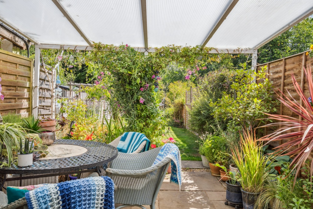 Outside, the level, south-facing, back garden is very pretty and divided into zones. There is a covered patio adjacent to the house followed by mature flower and shrub beds. The garden is private with access from both sides across neighbouring gardens. Brick pavers at the front provide parking for one vehicle.