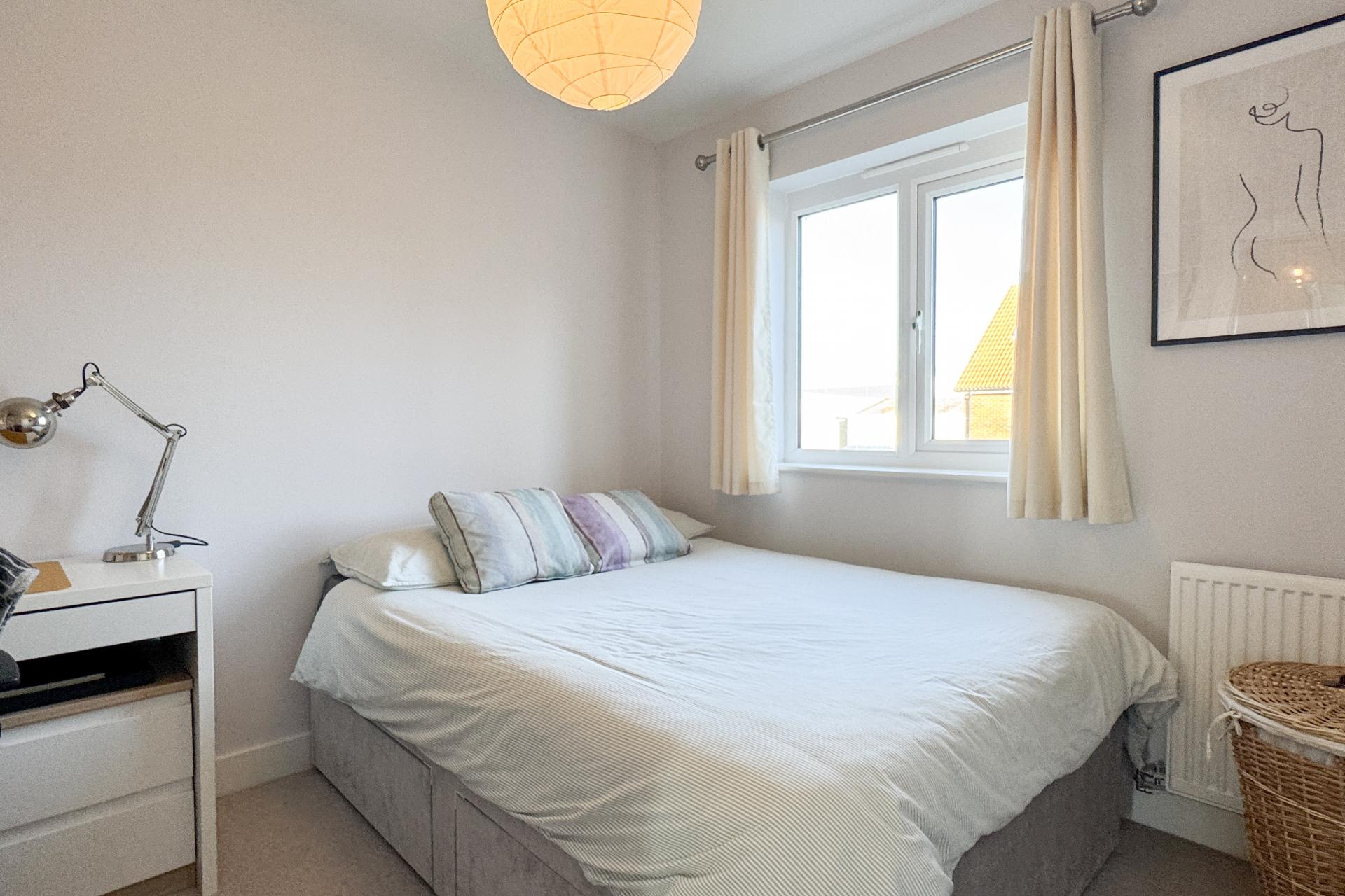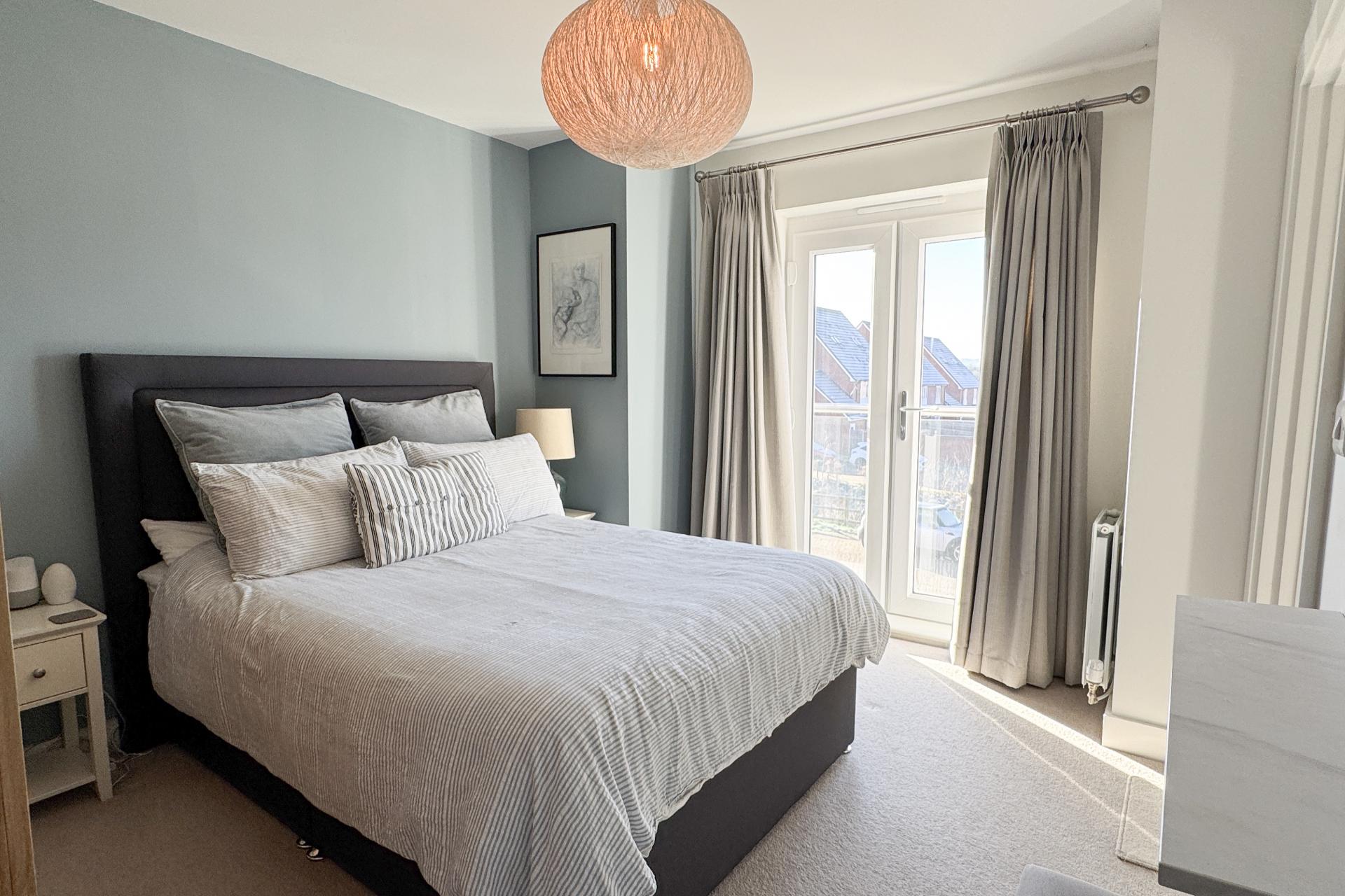Upstairs, the master bedroom at the rear of the property is a true feature, with double doors that open onto a Juliet balcony, offering stunning views of the Chiltern Hills. It also benefits from a modern en-suite shower room. The second bedroom provides ample space for a growing family or guests. The third bedroom would make an excellent home office. The family bathroom is well-appointed with a bath and overhead shower, offering convenience and style.