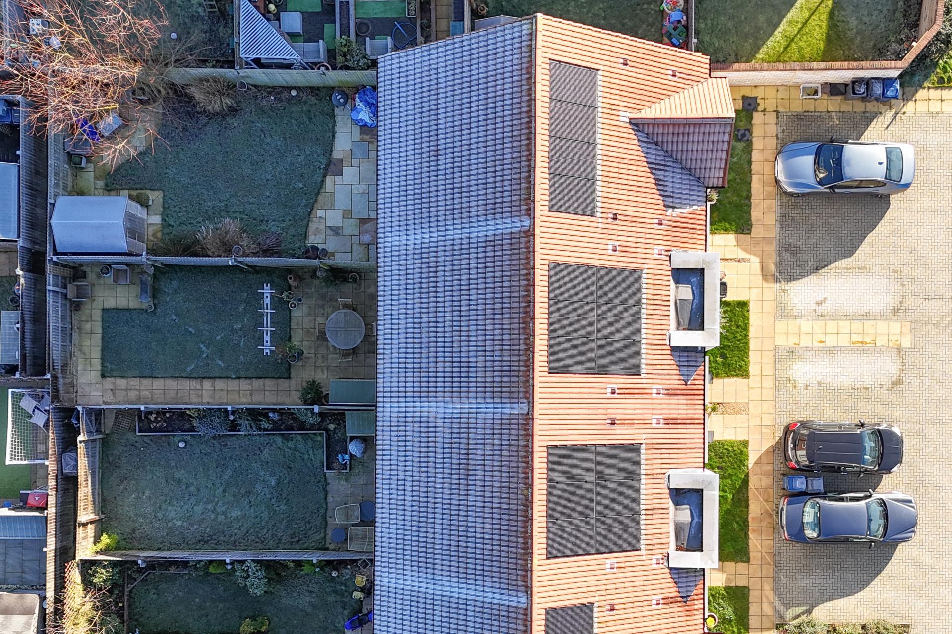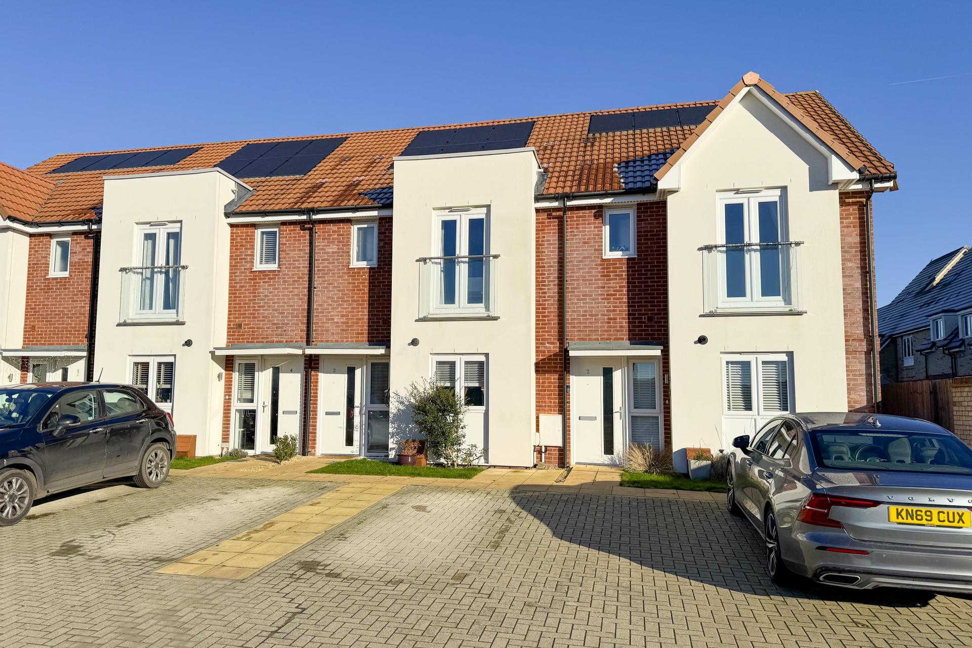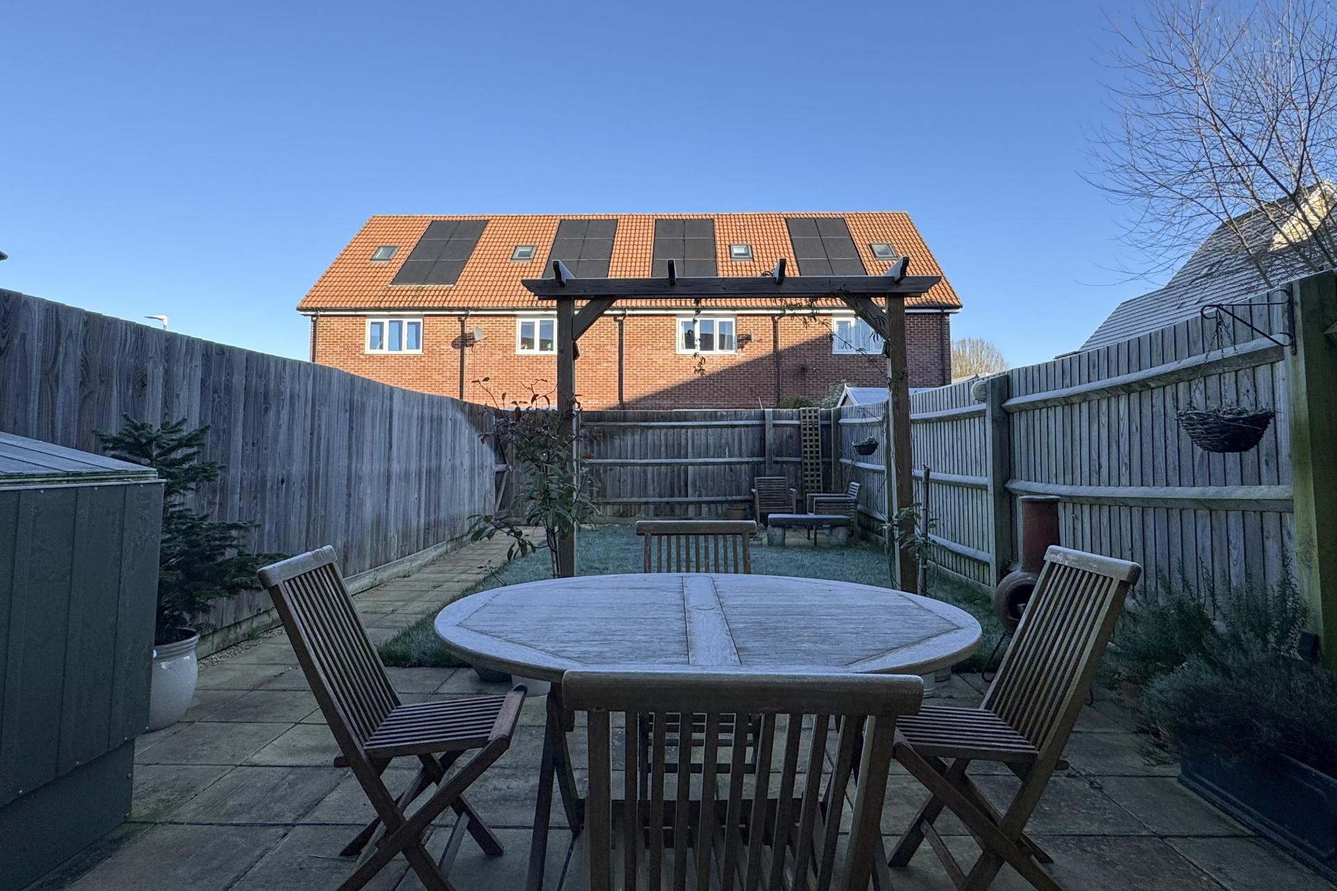 The rear garden is ideal for relaxation or entertaining, with a patio area, a well-maintained lawn, and back gate access. At the front of the property, there are two private parking spaces, along with additional visitor parking. Notably, the property is fitted with solar panels and includes a dedicated electric vehicle charger, making it an eco-conscious choice for modern living.